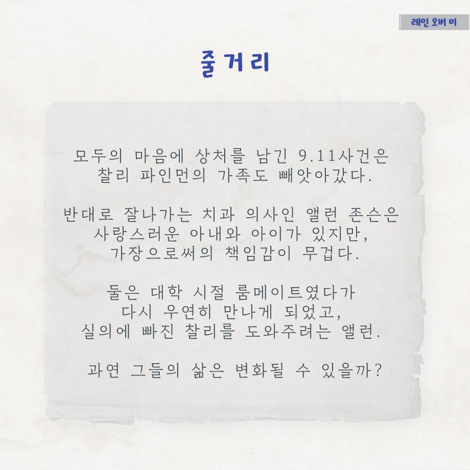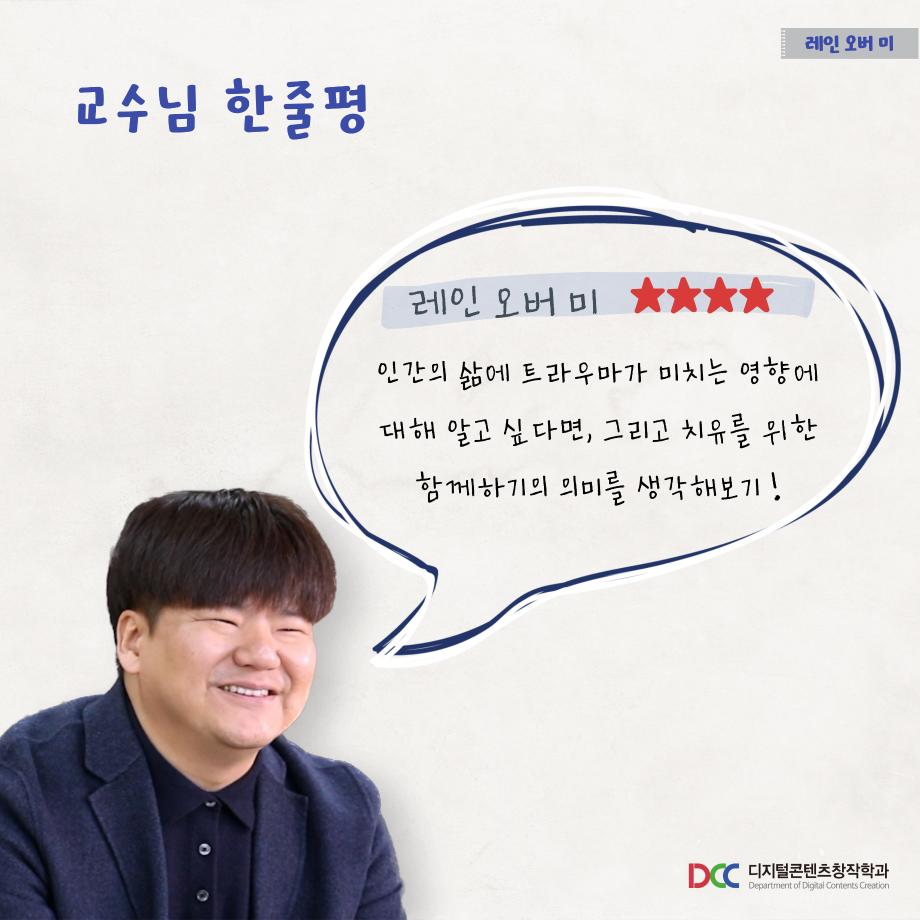 본문 시작 홈으로 MCC News 학과소개 교수소개 학과과정 MCC News MCC SNS 홈페이지가이드 학과 및 재학생 학과 및 재학생 교수 및 졸업생 미디어 정보통 학과 및 재학생 페이스북 트위터 프린트 디콘창이 추천하는 영화 추천 6선 1탄 디지털콘텐츠창작학과 4211 2022-12-08 세명대학교 디지털콘텐츠창작학과가 추천하는 영화 추천 6선 시리즈가 시작됩니다! 1탄의 추천 영화는 ‘레인 오버 미’입니다 😃 영화 추천 시리즈에서는 추천 영화의 줄거리, 스틸컷, 감상 가능한 사이트, 교수님의 한줄평까지 한눈에 볼 수 있습니다. 짧지만 알찬 정보는 담았으니, 다양한 장르의 추천 영화를 감상해 보시고 여러분들의 한줄평을 남겨주세요! 앞으로 올라올 5편도 학우분들의 많은 관심 부탁드립니다❤ 목록 이전부산중구스토리공모전-디지털콘텐츠창작학과 학생 5명 수상 다음 제20회 DCC콘텐츠페스티벌 사진첩 1탄! 담당부서 : 미디어콘텐츠창작학과 담당자 : - 연락처 : 043-649-1741 최종수정일 : 2024-10-26 만족도조사 만족도 조사 이 페이지에서 제공하는 정보에 대하여 만족하시나요? 매우만족 만족 보통 불만족 매우불만족