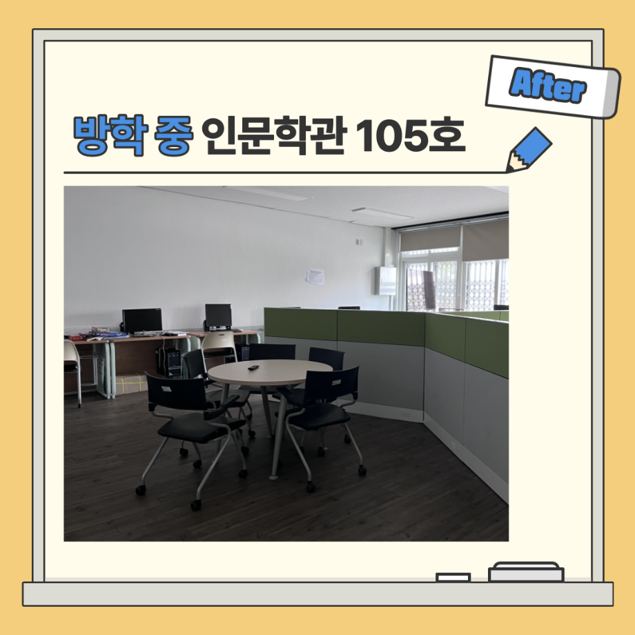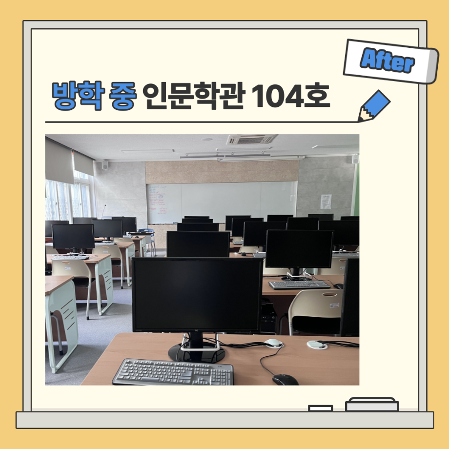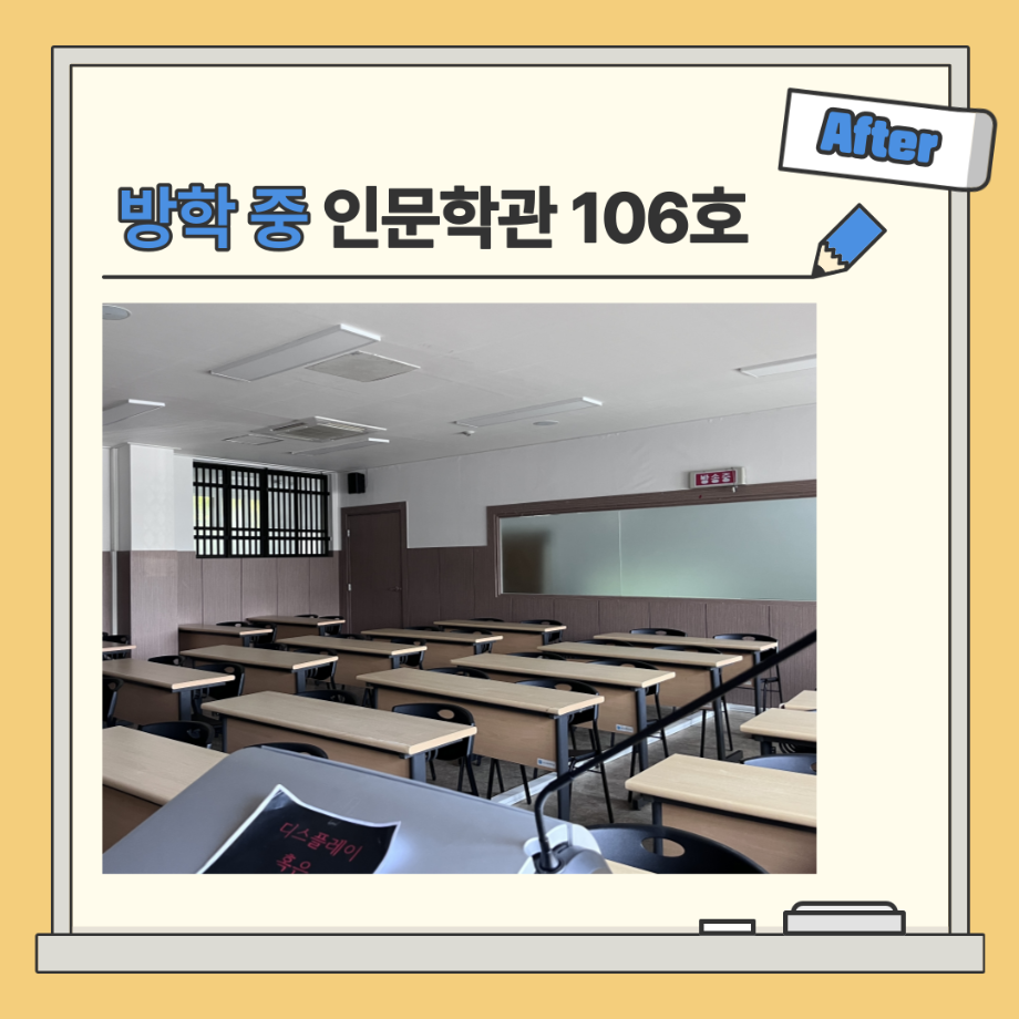본문 시작 홈으로 MCC News 학과소개 교수소개 학과과정 MCC News MCC SNS 홈페이지가이드 학과 및 재학생 학과 및 재학생 교수 및 졸업생 미디어 정보통 학과 및 재학생 페이스북 트위터 프린트 🏫 강의실 Before & After 🏫 디지털콘텐츠창작학과 3325 2023-06-30 학기 중과 방학 중의 인문학관 강의실 모습입니다! 북적북적하던 강의실이 방학이 되자마자 텅 빈 모습을 볼 수 있는데요! 텅 빈 강의실을 보니 큰 허전함이 느껴지는 것 같아요😥 디콘창 학우분들! 하계 방학동안 즐겁고 보람찬 방학을 즐기시길 바랍니다 :) 목록 이전🍭 오늘의 디콘 16탄 🍭 다음 세명대학교 홈페이지 공지사항 정리 담당부서 : 미디어콘텐츠창작학과 담당자 : - 연락처 : 043-649-1741 최종수정일 : 2024-10-26 만족도조사 만족도 조사 이 페이지에서 제공하는 정보에 대하여 만족하시나요? 매우만족 만족 보통 불만족 매우불만족