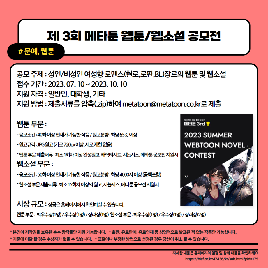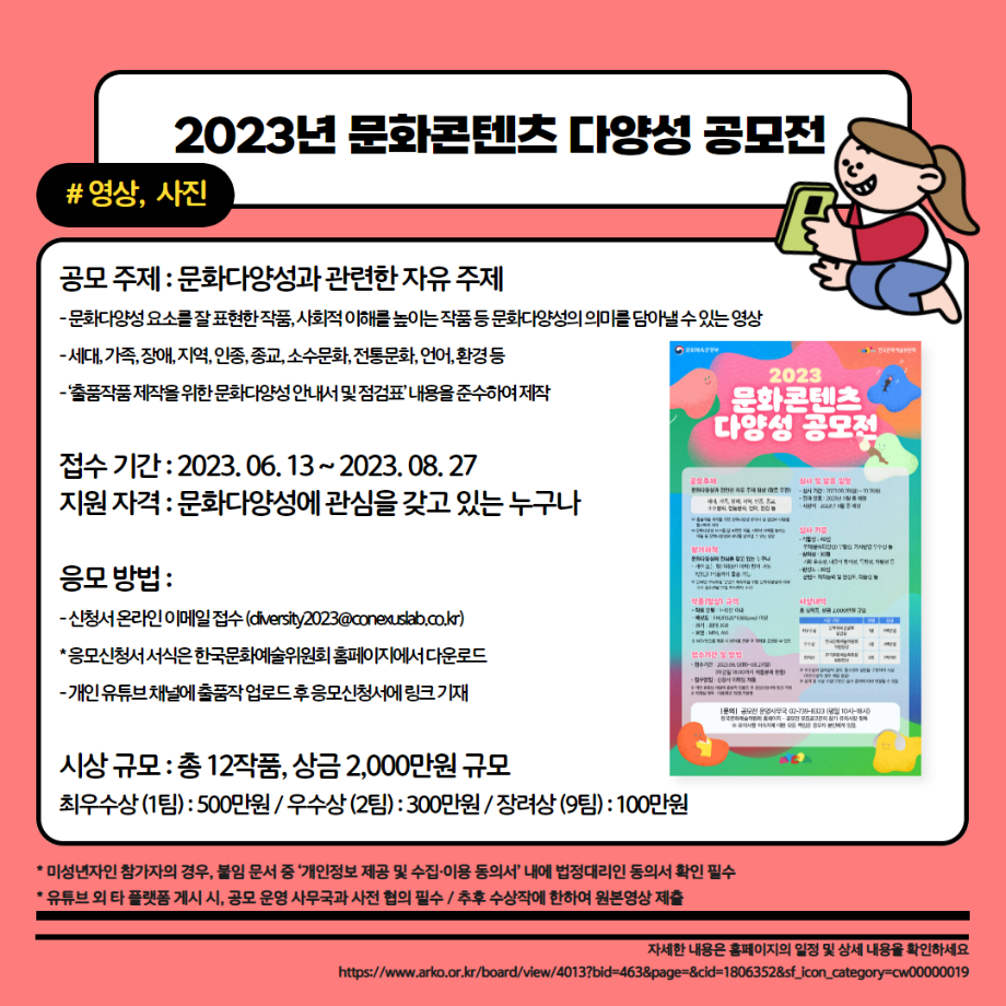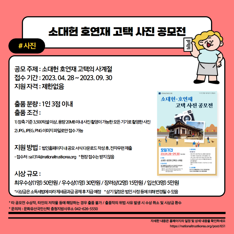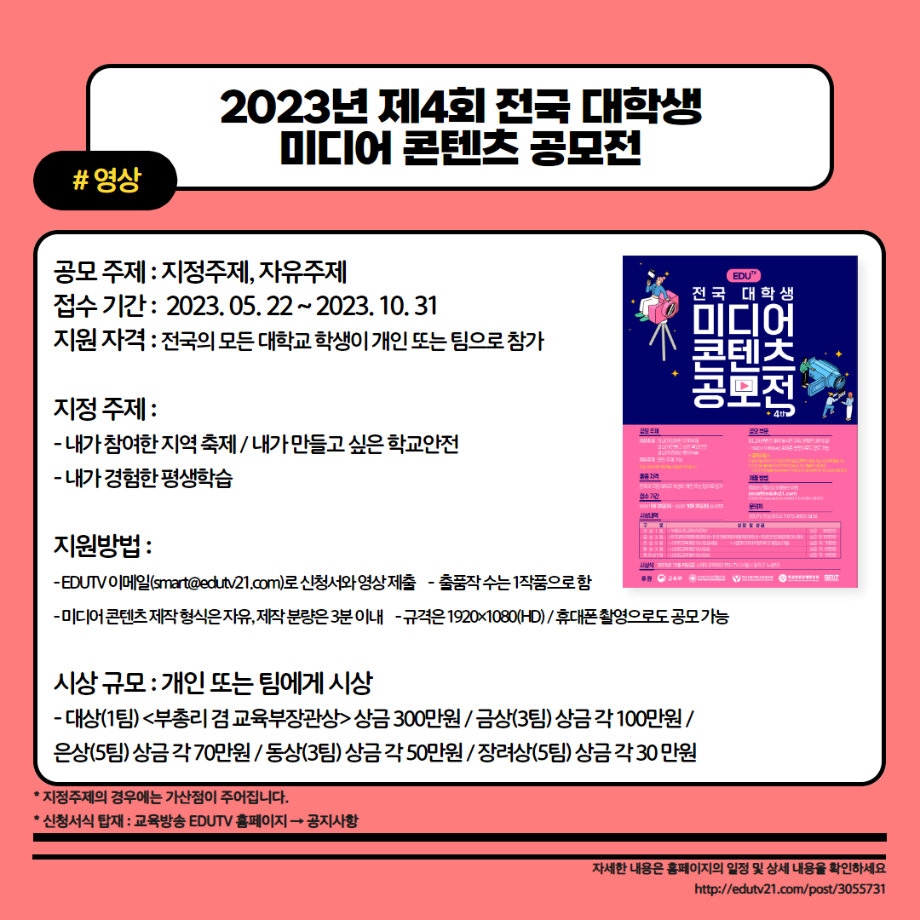 본문 시작 홈으로 MCC News 학과소개 교수소개 학과과정 MCC News MCC SNS 홈페이지가이드 학과 및 재학생 학과 및 재학생 교수 및 졸업생 미디어 정보통 학과 및 재학생 페이스북 트위터 프린트 23년도 교외 공모전 알려드려요‼ 3탄 디지털콘텐츠창작학과 3663 2023-08-14 23년도 영상, 디자인, 사진 분야의 공모전을 알려드립니다! 얼마 남지 않은 여름방학동안 공모전에 참여하면서 경험과 실력을 쌓을 수 있는 기회를 놓치지 마세요! 목록 이전📚디콘창이 알려주는 수강신청 안내📚 다음 이런 졸업작품도 있다고? "커뮤니케이션 통" 담당부서 : 미디어콘텐츠창작학과 담당자 : - 연락처 : 043-649-1741 최종수정일 : 2024-10-26 만족도조사 만족도 조사 이 페이지에서 제공하는 정보에 대하여 만족하시나요? 매우만족 만족 보통 불만족 매우불만족