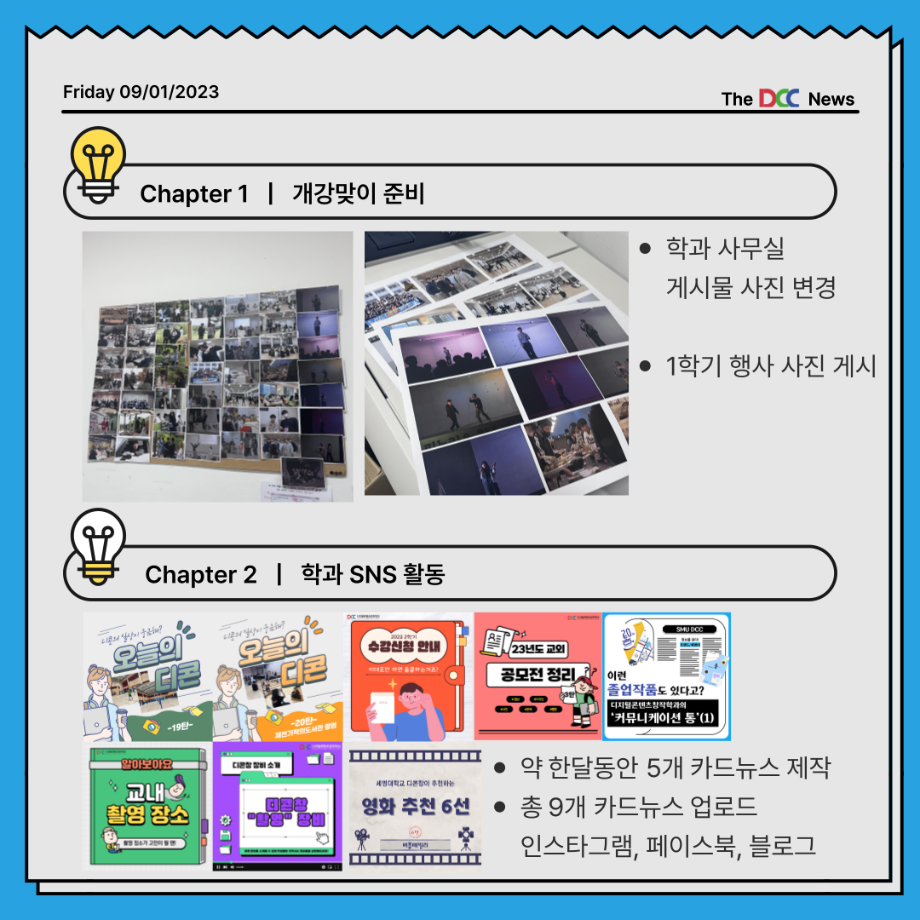 본문 시작 홈으로 MCC News 학과소개 교수소개 학과과정 MCC News MCC SNS 홈페이지가이드 학과 및 재학생 학과 및 재학생 교수 및 졸업생 미디어 정보통 학과 및 재학생 페이스북 트위터 프린트 📝디콘창 학생회 8월 월말결산 디지털콘텐츠창작학과 6645 2023-09-01 학생회가 하는 일이 궁금하시다고요? “디콘창 학생회 월말 결산”을 통해 학생회가 무슨 일을 했는지 알려드립니다🤗 매달 마지막 주에 업로드될 예정이니 많은 관심 부탁드려요!! 목록 이전디콘창이 추천하는 영화 추천 6선 6탄 다음 디지털콘텐츠창작학과, 장학금 마련을 위한 양심책방 운영 담당부서 : 미디어콘텐츠창작학과 담당자 : - 연락처 : 043-649-1741 최종수정일 : 2024-10-26 만족도조사 만족도 조사 이 페이지에서 제공하는 정보에 대하여 만족하시나요? 매우만족 만족 보통 불만족 매우불만족