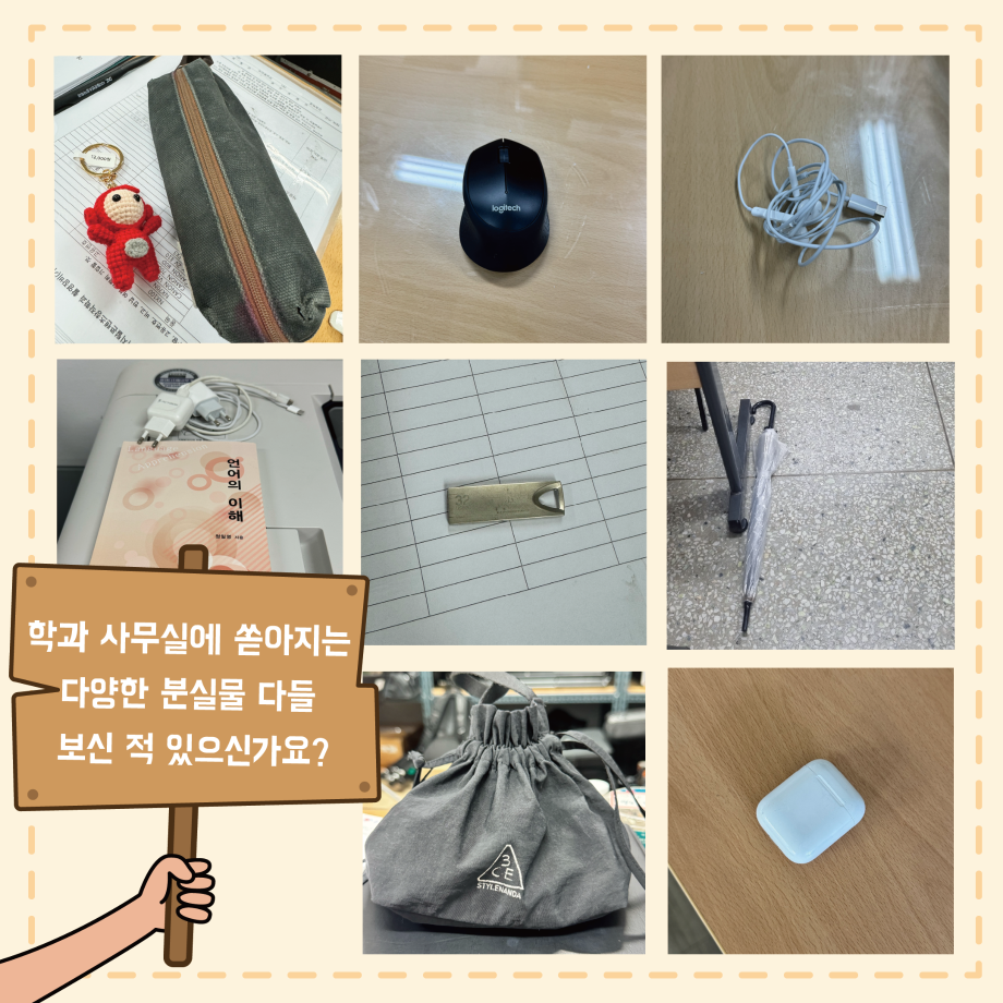 본문 시작 홈으로 MCC News 학과소개 교수소개 학과과정 MCC News MCC SNS 홈페이지가이드 학과 및 재학생 학과 및 재학생 교수 및 졸업생 미디어 정보통 학과 및 재학생 페이스북 트위터 프린트 MCC 내 물건은 내가 지키자! 미디어콘텐츠창작학과 2050 2024-10-24 학과 사무실에 쏟아지는 다양한 분실물 다들 보신 적 있으신가요? 매일마다 쏟아지는 분실물은 조교님을 힘들게 합니다. 다들 교실과 과방, 사무실을 비롯해 어느 곳에서든 본인 주변 책상, 의자, 바닥 등 본인의 물건은 꼭 챙기고 나오시길 바라요! 목록 이전2024년도 세명대학교 인문예술대학 문화콘텐츠 창작공모전 개최 다음 🚪MCC 추리 방탈출 "크라임씬"🔎🚪 담당부서 : 미디어콘텐츠창작학과 담당자 : - 연락처 : 043-649-1741 최종수정일 : 2024-10-26 만족도조사 만족도 조사 이 페이지에서 제공하는 정보에 대하여 만족하시나요? 매우만족 만족 보통 불만족 매우불만족