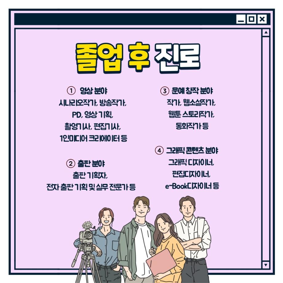 또한 광고홍보학과와 연계한 e-Book디자인·제작학 연계전공을 통해 전자책 디자인 및 제작을 집중 학습하고 졸업 시 출판학사 학위가 추가로 수여되며, 시각영상디자인학과와 연계한 AR·VR 콘텐츠디자인학 연계전공을 통해 AR•VR 콘텐츠 디자인 및 제작을 집중 학습하고 졸업시 AR•VR 콘텐츠디자인학사 학위가 추가로 수여됩니다.