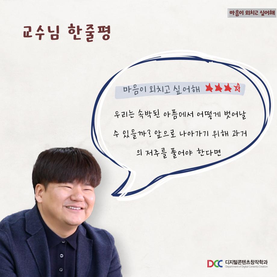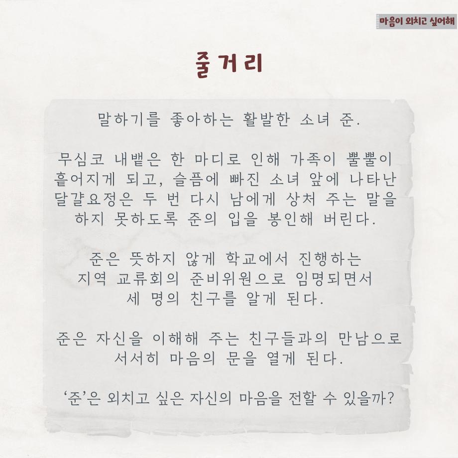 본문 시작 홈으로 MCC News 학과소개 교수소개 학과과정 MCC News MCC SNS 홈페이지가이드 학과 및 재학생 학과 및 재학생 교수 및 졸업생 미디어 정보통 학과 및 재학생 페이스북 트위터 프린트 디콘창이 추천하는 영화 추천 6선 2탄 디지털콘텐츠창작학과 3700 2023-01-02 세명대학교 디지털콘텐츠창작학과가 추천하는 영화 추천 6선 시리즈 두 번째입니다! 2탄 추천 영화는 '마음이 외치고 싶어해'입니다. 😃 영화 추천 시리즈에서는 추천 영화의 줄거리, 스틸컷, 감상 가능한 사이트, 교수님의 한줄평까지 한눈에 볼 수 있습니다. 짧지만 알찬 정보는 담았으니, 다양한 장르의 추천 영화를 감상해 보시고 여러분들의 한줄평을 남겨주세요! 앞으로 올라올 4편도 학우분들의 많은 관심 부탁드립니다❤ 목록 이전제20회 DCC콘텐츠페스티벌 개최! 다음 🐰 2023년 계묘년 희망찬 새해를 맞았습니다! 🐰 담당부서 : 미디어콘텐츠창작학과 담당자 : - 연락처 : 043-649-1741 최종수정일 : 2024-10-26 만족도조사 만족도 조사 이 페이지에서 제공하는 정보에 대하여 만족하시나요? 매우만족 만족 보통 불만족 매우불만족