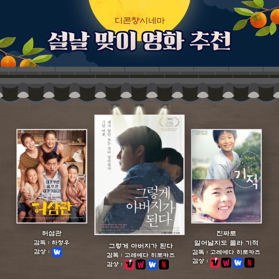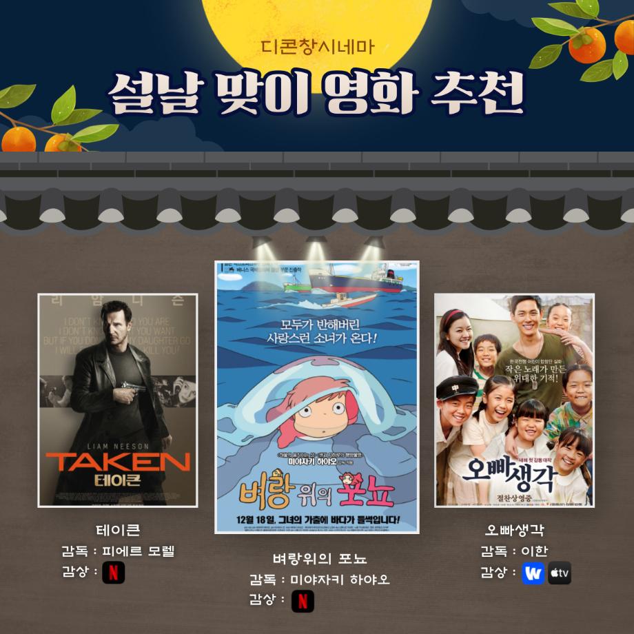 본문 시작 홈으로 MCC News 학과소개 교수소개 학과과정 MCC News MCC SNS 홈페이지가이드 학과 및 재학생 학과 및 재학생 교수 및 졸업생 미디어 정보통 학과 및 재학생 페이스북 트위터 프린트 설날 맞이 영화 추천 디지털콘텐츠창작학과 3955 2023-01-20 명절을 맞이해서 가족과 함께 볼 수 있는 영화를 추천해 드려요! 이번 설에는 가족과 함께 영화를 보는 건 어떨까요? 목록 이전🍭 오늘의 디콘 11탄 🍭 다음 세명인이라면 알아야 할 꿀팁 앱 담당부서 : 미디어콘텐츠창작학과 담당자 : - 연락처 : 043-649-1741 최종수정일 : 2024-10-26 만족도조사 만족도 조사 이 페이지에서 제공하는 정보에 대하여 만족하시나요? 매우만족 만족 보통 불만족 매우불만족