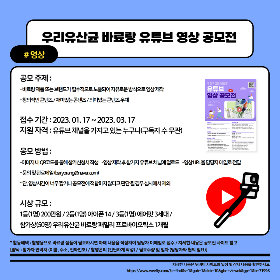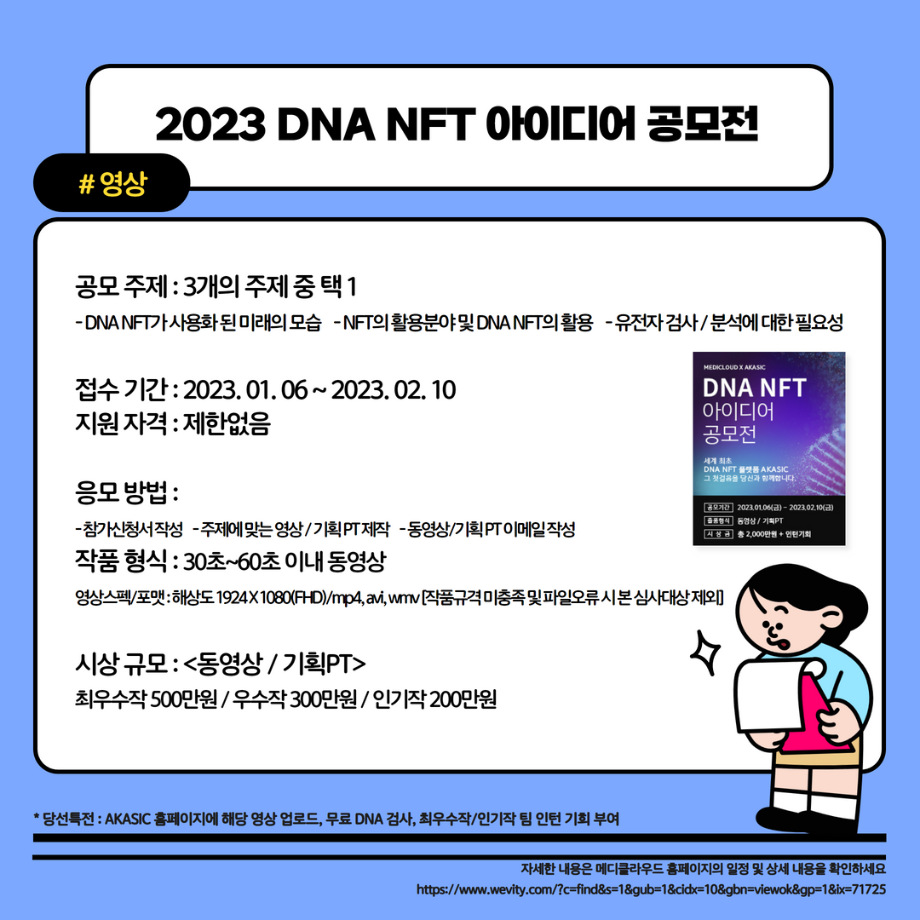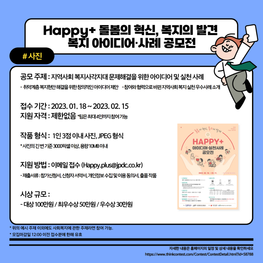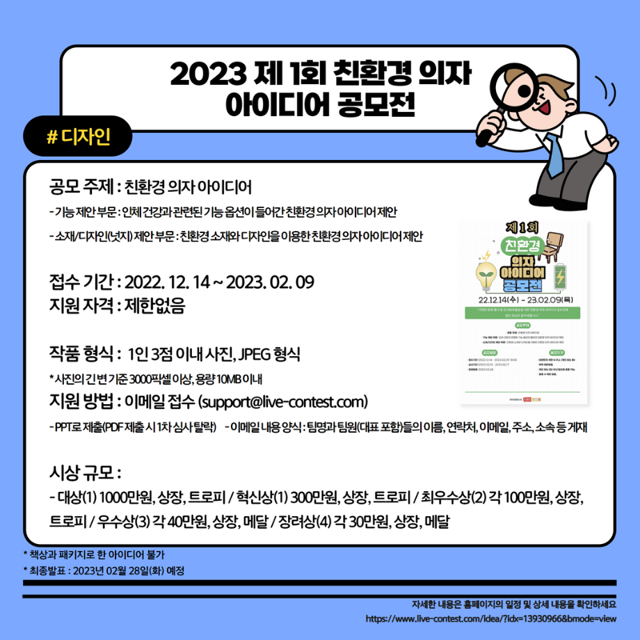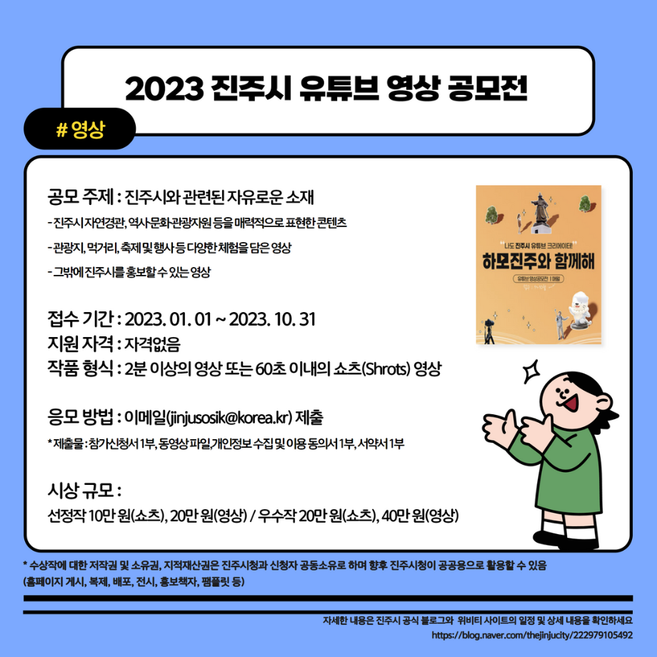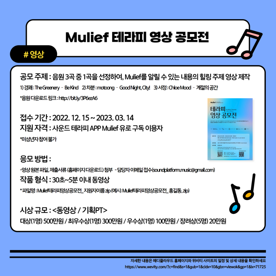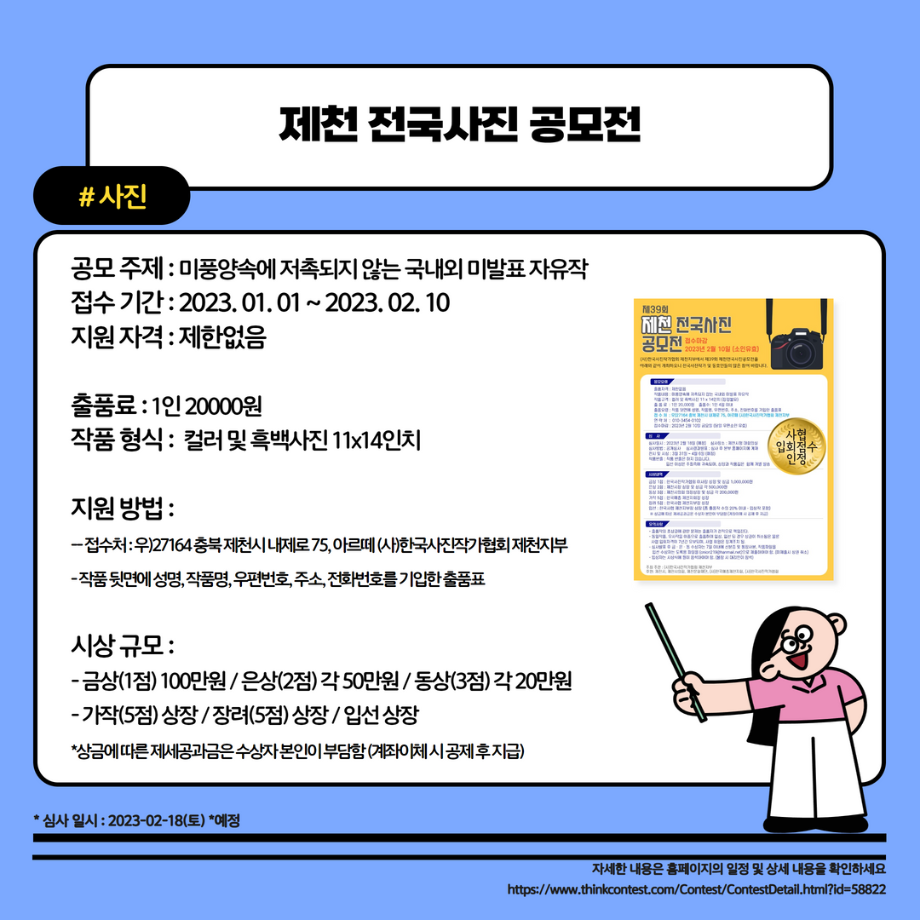 본문 시작 홈으로 MCC News 학과소개 교수소개 학과과정 MCC News MCC SNS 홈페이지가이드 학과 및 재학생 학과 및 재학생 교수 및 졸업생 미디어 정보통 학과 및 재학생 페이스북 트위터 프린트 2023학년도 교외 공모전을 알려드려요 디지털콘텐츠창작학과 4278 2023-02-01 2023학년도 영상, 디자인, 사진 분야의 공모전을 알려드립니다! 겨울방학 동안 다양한 공모전에 참여하며 경험을 쌓는 것은 어떨까요? 목록 이전세명인이라면 알아야 할 꿀팁 앱 다음 23학번 신입생들을 위한 디콘창 Q&A❓ 담당부서 : 미디어콘텐츠창작학과 담당자 : - 연락처 : 043-649-1741 최종수정일 : 2024-10-26 만족도조사 만족도 조사 이 페이지에서 제공하는 정보에 대하여 만족하시나요? 매우만족 만족 보통 불만족 매우불만족