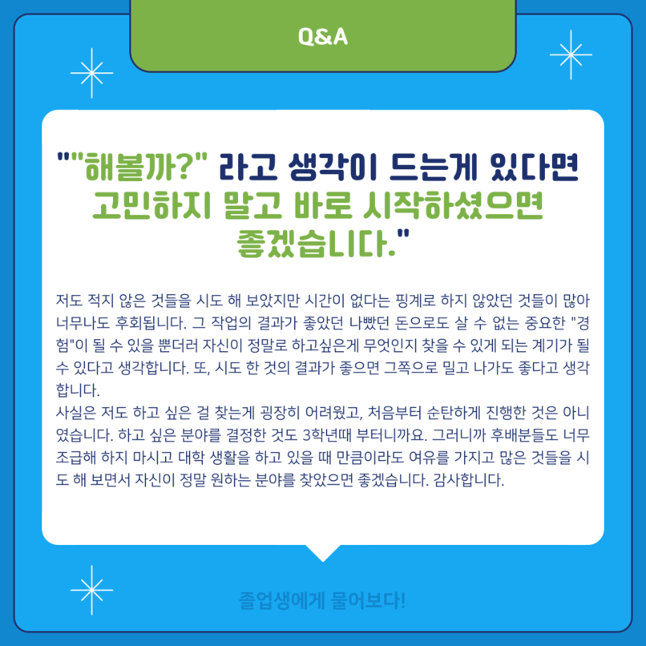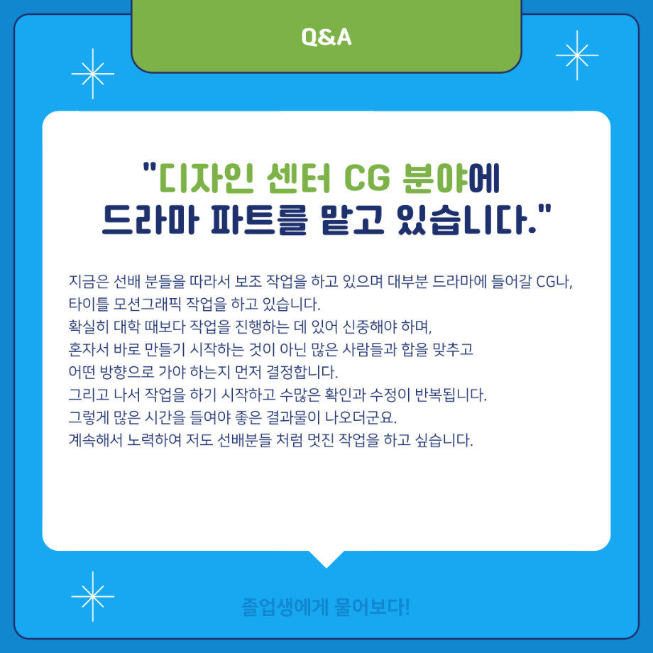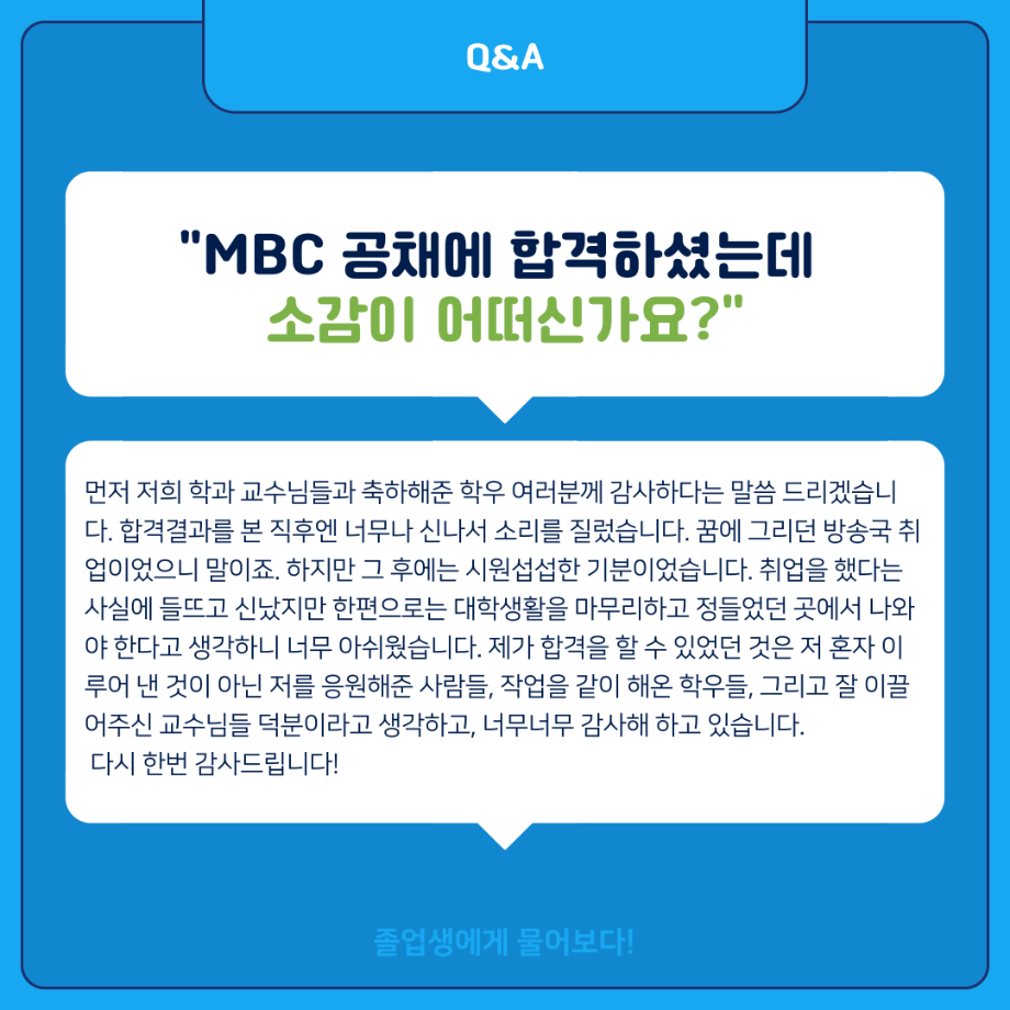 본문 시작 홈으로 MCC News 학과소개 교수소개 학과과정 MCC News MCC SNS 홈페이지가이드 학과 및 재학생 학과 및 재학생 교수 및 졸업생 미디어 정보통 학과 및 재학생 페이스북 트위터 프린트 ‼재학생이 묻고 졸업생이 답하다‼ 디지털콘텐츠창작학과 2856 2024-02-01 MBC 본사 영상미술국 공채시험 합격을 하신 김민재 선배님의 인터뷰 내용을 담았습니다! 재학생분들의 도움이 되길 바라며 많은 관심 부탁드립니다! 목록 이전배고픈 대학생을 통해 알아본 먹거리&맛집&맛팁 소개(2) 다음 👨🎓👩🎓 디지털콘텐츠창작학과 학위수여식 담당부서 : 미디어콘텐츠창작학과 담당자 : - 연락처 : 043-649-1741 최종수정일 : 2024-10-26 만족도조사 만족도 조사 이 페이지에서 제공하는 정보에 대하여 만족하시나요? 매우만족 만족 보통 불만족 매우불만족