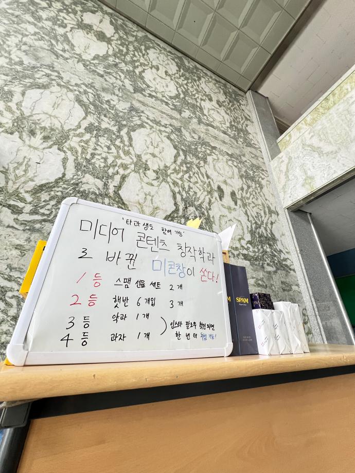 본문 시작 홈으로 MCC News 학과소개 교수소개 학과과정 MCC News MCC SNS 홈페이지가이드 학과 및 재학생 학과 및 재학생 교수 및 졸업생 미디어 정보통 학과 및 재학생 페이스북 트위터 프린트 2024년 추석맞이 특별 이벤트 미디어콘텐츠창작학과 1976 2024-09-13 지난 11일 미디어콘텐츠창작학과 학생회에서 추석맞이 특별 이벤트를 진행했습니다! 추석을 맞이해 학우 여러분들이 뽑기를 통해 다양한 상품을 받아 가셨는데요! 여러분들의 성원에 힘 입어 이벤트 시작 3시간 만에 상품 소진으로 인해 종료하였습니다. 미콘창 학생 뿐만이 아닌 타과 학생 분들도 뽑기에 참여하여 함께 하는 미콘창의 모습을 보여줄 수 있었습니다! 목록 이전디콘창, 미디어콘텐츠창작학과로 이름을 변경하다?! 다음 오랜만에 찾아온 미콘먹거리! 담당부서 : 미디어콘텐츠창작학과 담당자 : - 연락처 : 043-649-1741 최종수정일 : 2024-10-26 만족도조사 만족도 조사 이 페이지에서 제공하는 정보에 대하여 만족하시나요? 매우만족 만족 보통 불만족 매우불만족