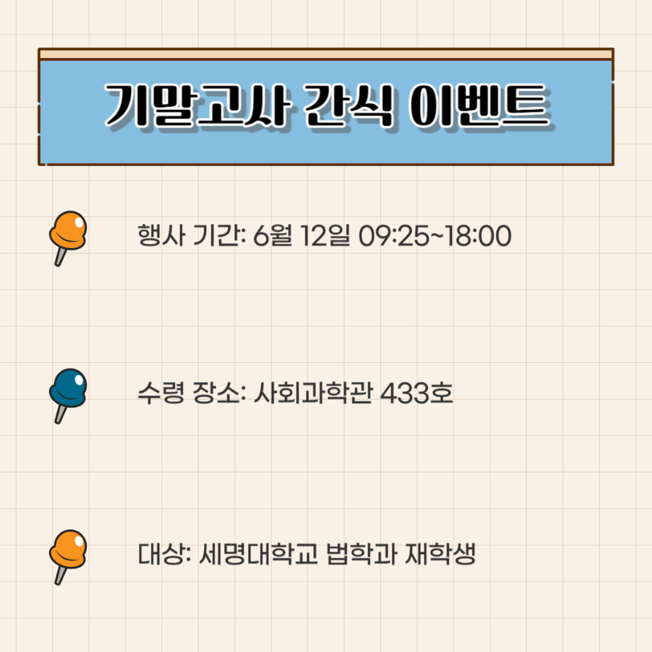본문 시작 홈으로 커뮤니티 학과안내 교수소개 학과과정 커뮤니티 홈페이지가이드 학과사진첩 공지사항 취업정보 학과사진첩 학과행사 동아리 학생회 교우소식 학과사진첩 페이스북 트위터 프린트 법학과 간식 이벤트🍪 법학과 1553 2025-06-12 법학과 학생회 "다온" 에서 시험으로 지친 학생들을 위해 간식이벤트를 준비했습니다:) 목록 이전2025학년도 법학과 학술캠프 다음 법학과 선배들의 진로 현황 담당부서 : 법학과 담당자 : - 연락처 : 043-649-1764 최종수정일 : 2024-10-26 만족도조사 만족도 조사 이 페이지에서 제공하는 정보에 대하여 만족하시나요? 매우만족 만족 보통 불만족 매우불만족