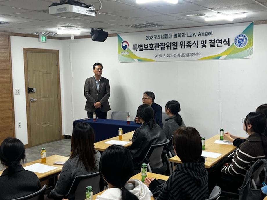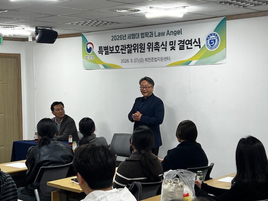 본문 시작 홈으로 커뮤니티 학과안내 교수소개 학과과정 커뮤니티 홈페이지가이드 학과사진첩 공지사항 취업정보 학과사진첩 학과행사 동아리 학생회 교우소식 학과사진첩 페이스북 트위터 프린트 2026. 03. 27. Law Angel 위촉식 법학과 44 2026-04-01 지난 3월 27(금) 15:30에 제천보호관찰소에서 로엔젤 학생들이 특별보호관찰위원 위촉식을 진행하였습니다. 목록 이전겨울방학 해외 배낭여행-푸꾸옥 담당부서 : 법학과 담당자 : - 연락처 : 043-649-1764 최종수정일 : 2024-10-26 만족도조사 만족도 조사 이 페이지에서 제공하는 정보에 대하여 만족하시나요? 매우만족 만족 보통 불만족 매우불만족