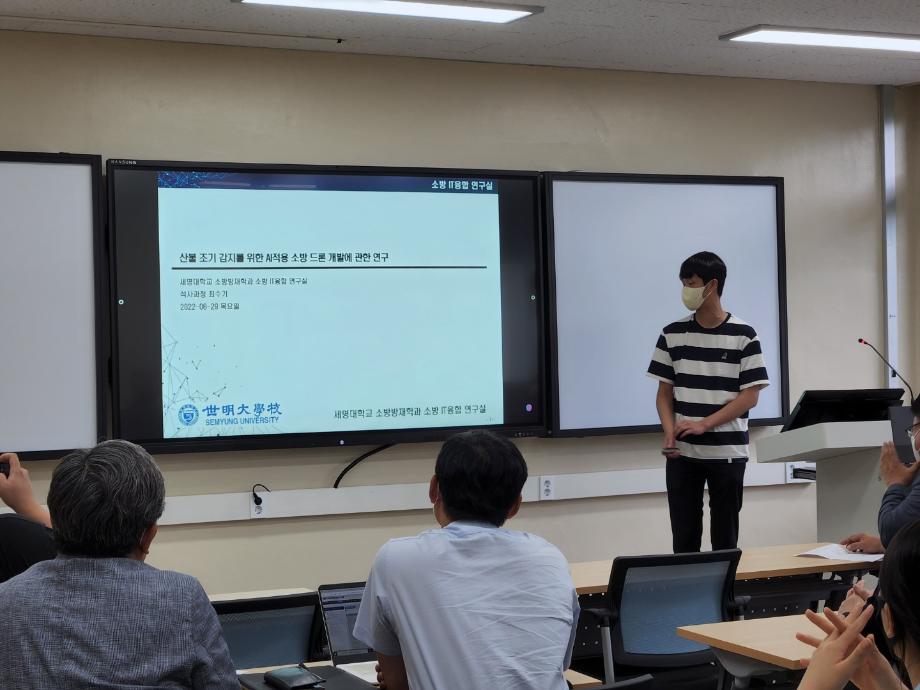 연합 세미나에서는 세명대학교 소방 IT 융합연구실의 최수기 학생, 강원대학교 방재전문대학원 김승준 학생, 세명대학교 건설방재연구실의 김원창 학생 순서로 연구실 소개 및 세미나 발표가 진행되었습니다.