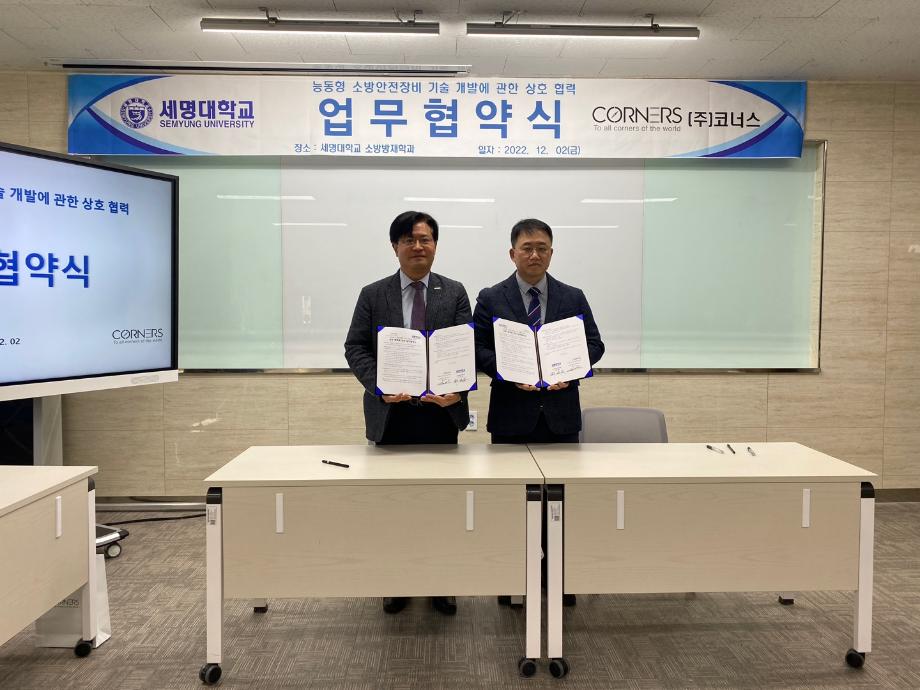 (주) 코너스 mou 와 세명대학교 소방방재학과(학과장 정해영) 업무 협약식에는 (주) 코너스 대표님께서 직접 참석하셨습니다.