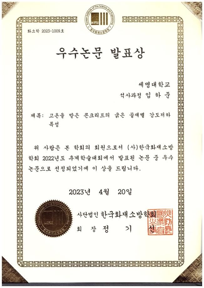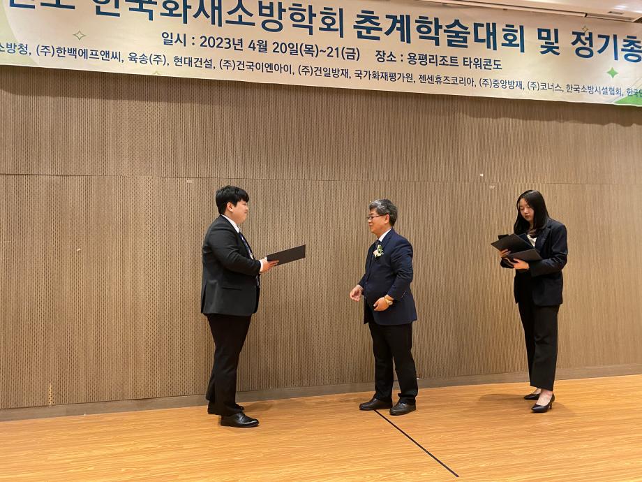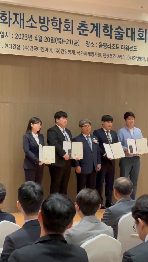 본문 시작 홈으로 커뮤니티 학과소개 교수소개 전공과정 커뮤니티 홈페이지가이드 학과행사 학과공지 채용정보 학사일정 학과행사 동아리 소방방재학과의 자랑 궁금합니다 수험생 Q&A 학과행사 페이스북 트위터 프린트 2023년 한국화재소방학회 춘계 학술대회 소방방재학과 6073 2023-04-27 한국화재소방학회가 2023년 춘계 학술대회를 개최하였습니다. 2023.04.20부터 202304.21까지 이틀 간 진행하였고, 국내 화재 소방 전문가 180여 명이 참석하였으며, 소방방재공학과 소방IT 융합 연구실 연구생과 건설방재연구실 연구생 10명이 참가하였습니다. 또한 건설방재연구실 석사과정 임하준 연구원이 우수논문발표상을 수상하는 쾌거를 이뤘습니다. 목록 이전소방시설관리사 특강 다음 2023학년도 스승의 날 행사 담당부서 : 소방방재학과 담당자 : - 연락처 : 043-649-1787 최종수정일 : 2024-10-26 만족도조사 만족도 조사 이 페이지에서 제공하는 정보에 대하여 만족하시나요? 매우만족 만족 보통 불만족 매우불만족