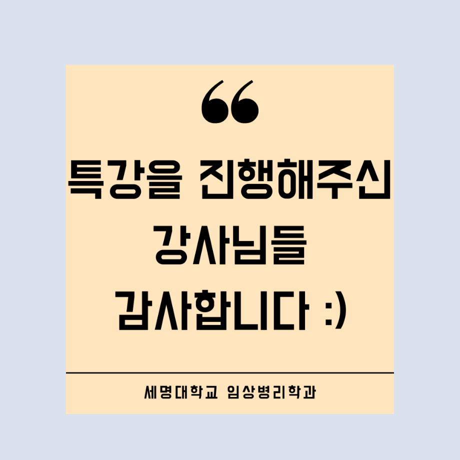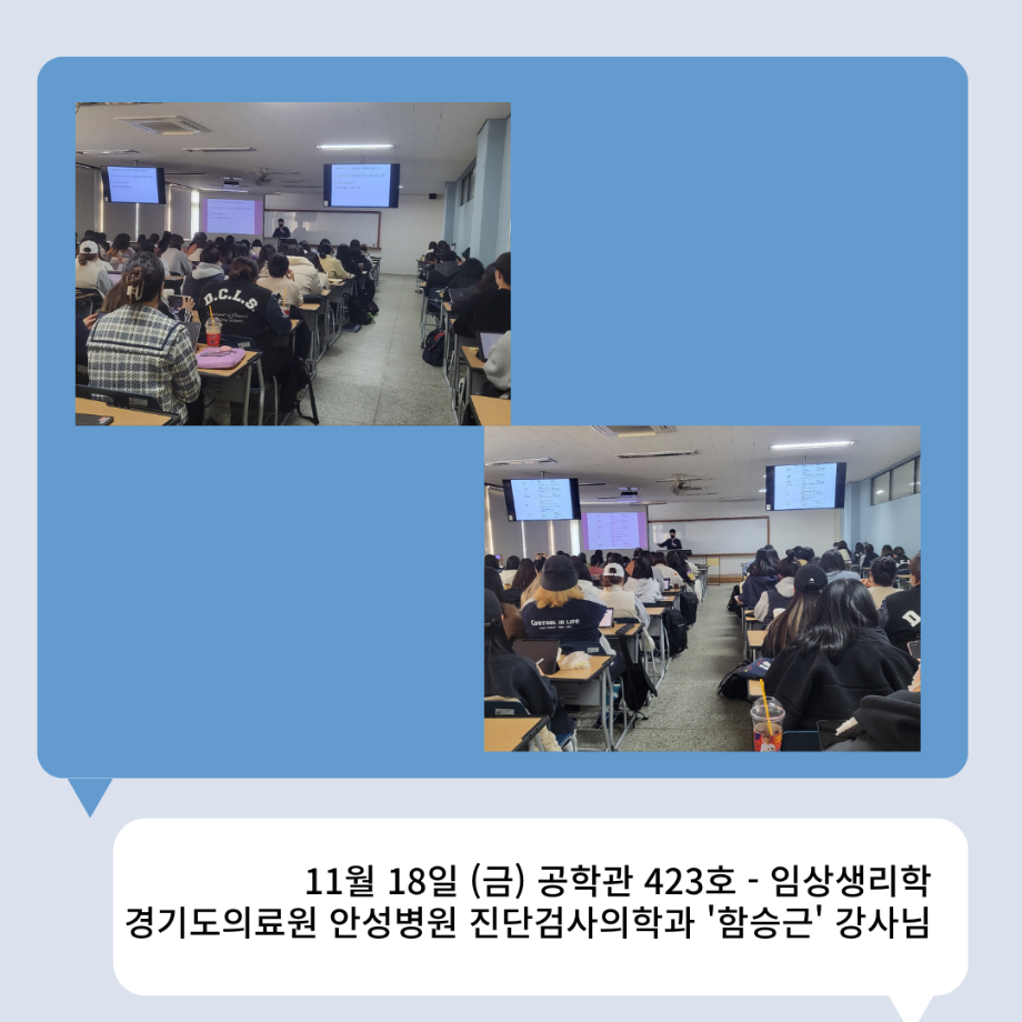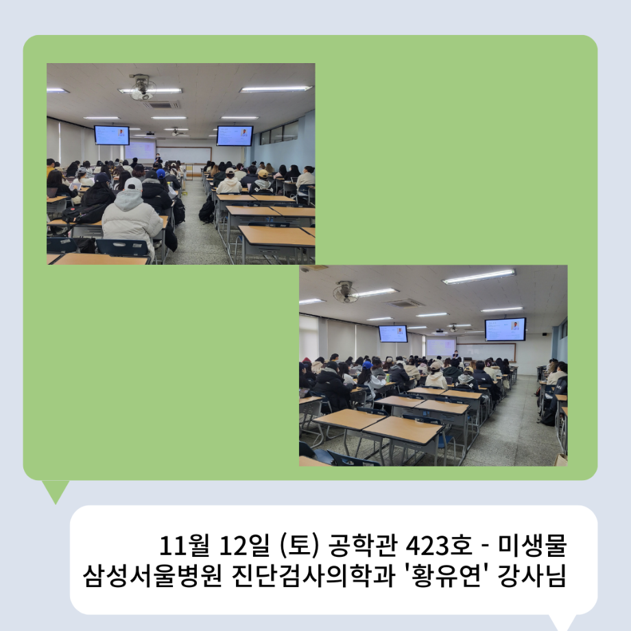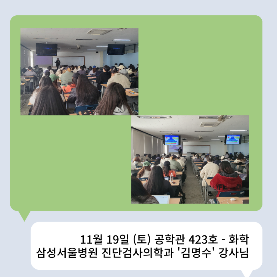 본문 시작 👨🔬2022년 3학년 실습특강👨🔬 임상병리학과 7003 2023-01-16 2022년 3학년 병원 실습 특강을 대신하여 각 분야의 강사님들을 초빙하여 강의를 진행해 주셨습니다. 병원실습을 못 간 대신 병원과 취업에 대해 궁금한 것에 대해 질문도 하는 유익한 시간이었습니다~ ✨ 강의를 진행해 주신 강사님들 감사합니다 🙂 ✨ 목록 이전🤖 3학년 세균학및실험 수업 실습영상 🤖 - 3주차 다음 2022 임상병리학과 MT 담당부서 : 임상병리학과 담당자 : - 연락처 : 043-649-1537 최종수정일 : 2024-10-26 만족도조사 만족도 조사 이 페이지에서 제공하는 정보에 대하여 만족하시나요? 매우만족 만족 보통 불만족 매우불만족