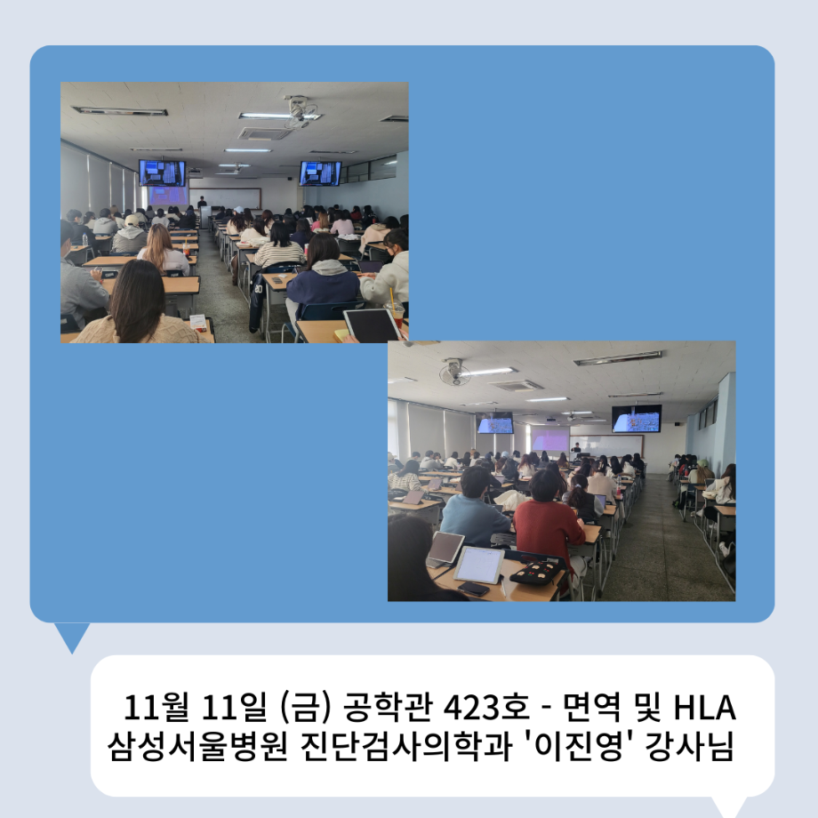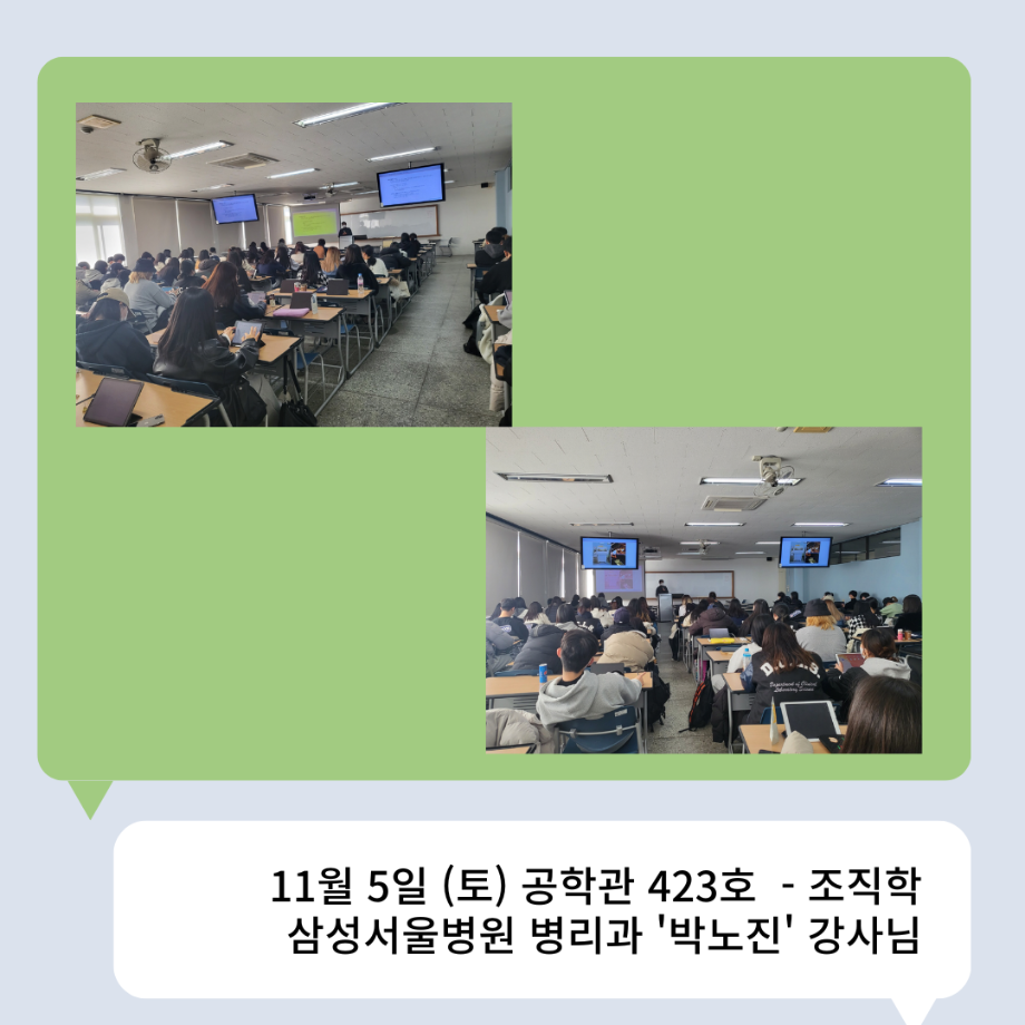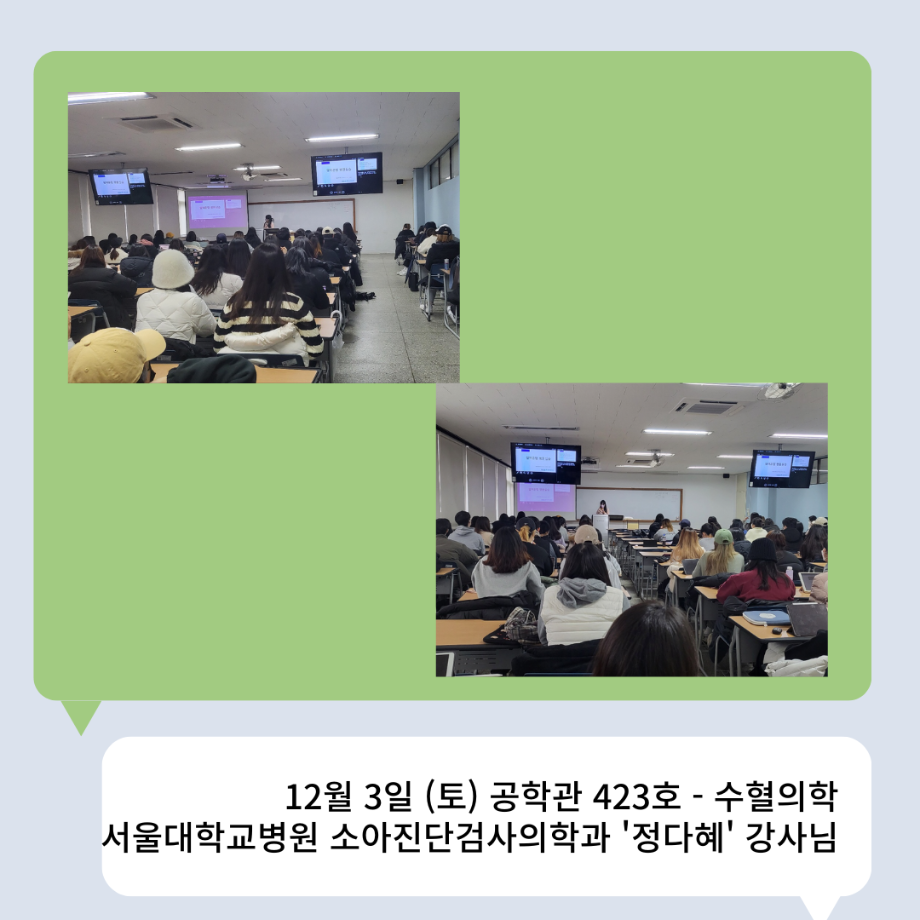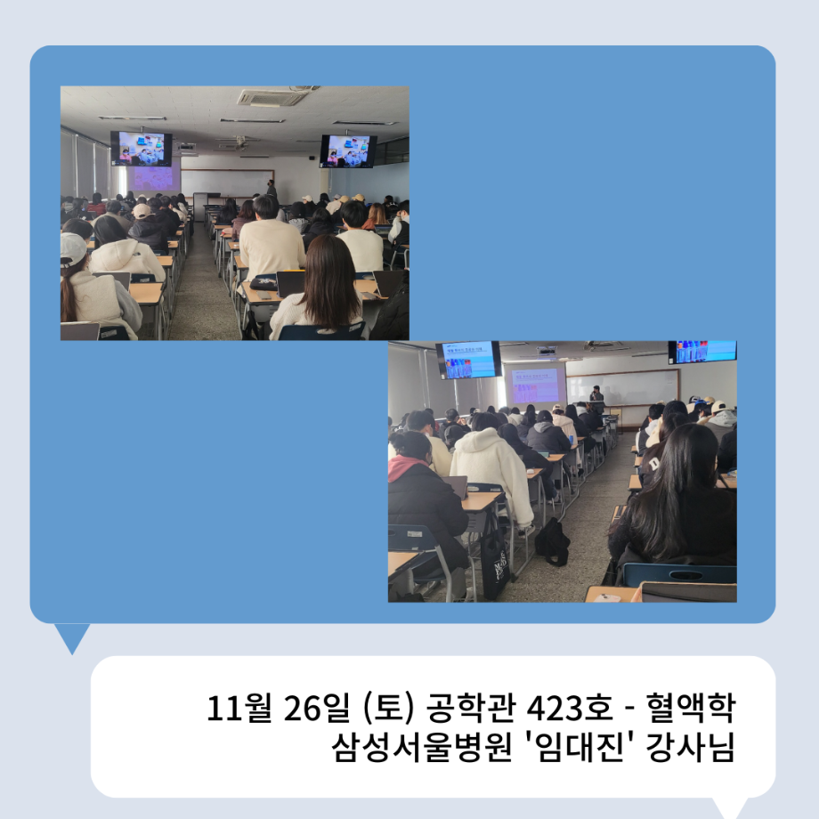 본문 시작 👨🔬2022년 3학년 실습특강👨🔬 임상병리학과 7003 2023-01-16 2022년 3학년 병원 실습 특강을 대신하여 각 분야의 강사님들을 초빙하여 강의를 진행해 주셨습니다. 병원실습을 못 간 대신 병원과 취업에 대해 궁금한 것에 대해 질문도 하는 유익한 시간이었습니다~ ✨ 강의를 진행해 주신 강사님들 감사합니다 🙂 ✨ 목록 이전🤖 3학년 세균학및실험 수업 실습영상 🤖 - 3주차 다음 2022 임상병리학과 MT 담당부서 : 임상병리학과 담당자 : - 연락처 : 043-649-1537 최종수정일 : 2024-10-26 만족도조사 만족도 조사 이 페이지에서 제공하는 정보에 대하여 만족하시나요? 매우만족 만족 보통 불만족 매우불만족