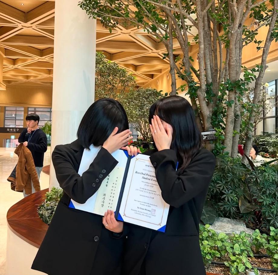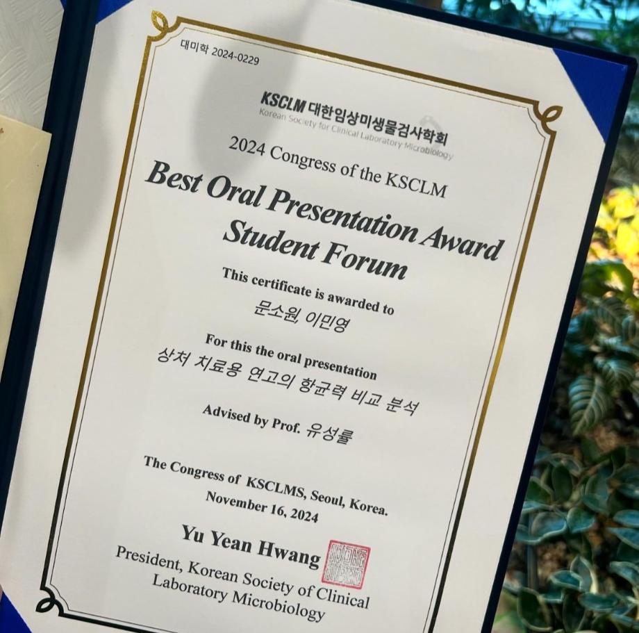 본문 시작 KSCLM 대한미생물검사학회 최우수상 임상병리학과 3203 2024-11-21 세명대학교 임상병리학과 이민영,문소원 학생이 지난 11월 16일 KSCLM 대한미생물검사학괴에서 '상처 치료제의 항균력 비교 분석' 이라는 주제로 발표하여 최우수상을 수상하였습니다. 앞으로도 많은 학생이 다양한 행사와 연구에 참여하여 많은 성과를 얻어갔으면 합니다! 다시 한번 수상을 진심으로 축하합니다 !! 목록 다음 헌혈 버스 오는 날 이전졸업 선물 이벤트 담당부서 : 임상병리학과 담당자 : - 연락처 : 043-649-1537 최종수정일 : 2024-10-26 만족도조사 만족도 조사 이 페이지에서 제공하는 정보에 대하여 만족하시나요? 매우만족 만족 보통 불만족 매우불만족