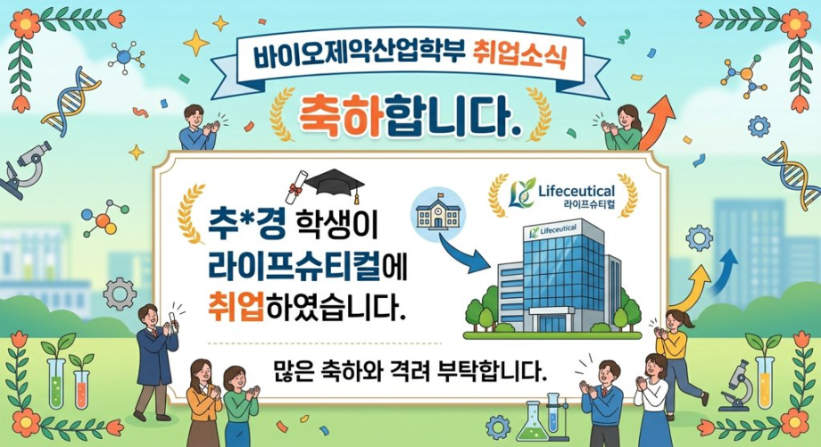 본문 시작 홈으로 학부자료실 학부소개 교육과정 학부공지게시판 학부자료실 홈페이지가이드 학부행사 및 사진게시판 학부행사 및 사진게시판 학생회 소개 학부행사 및 사진게시판 페이스북 트위터 프린트 축하합니다. 추*경 학생이 라이프 슈티컬에 취업하였습니다. 바이오제약산업학부 24 2026-04-27 축하합니다. 추*경 학생이 라이프 슈티컬에 취업하였습니다. 목록 이전GC-MS 기기 활용 활동 다음 축하합니다. 이*서 학생이 시마즈사이언티픽코리아에 취업하였습니다. 담당부서 : 바이오제약산업학부 담당자 : - 연락처 : 043-649-1729 최종수정일 : 2024-10-26 만족도조사 만족도 조사 이 페이지에서 제공하는 정보에 대하여 만족하시나요? 매우만족 만족 보통 불만족 매우불만족