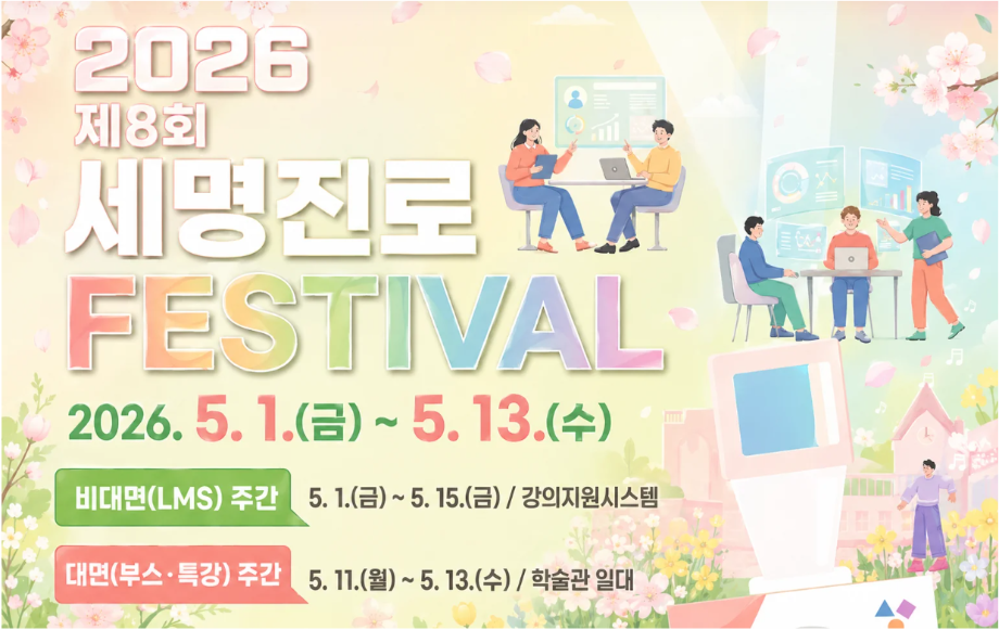 나. 비대면특강 : 강의지원 ▶ 교육현황 ▶ 개설과목검색 ▶ 비정규과목 ▶[2026 세명진로 Festival_강의명] 검색 ▶ 안내사항 필독 ▶ 신청하기