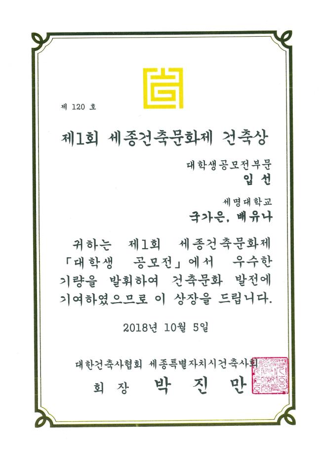 본문 시작 홈으로 커뮤니티 학과소개 교수소개 교육과정 학과 행사 및 활동 커뮤니티 홈페이지가이드 페이스북 트위터 프린트 제1회 세종건축문화제 건축상 수상 건축공학과 10787 2018-10-15 제1회 세종건축문화제 건축상 대학생공모전부문 입선 성명: 국가은, 배유나 목록 이전2017 한국건설관리학회 정기학술발표대회 우수논문상 수상 다음 전국대학생 학술발표대회 논문 부분 수상 만족도조사 만족도 조사 이 페이지에서 제공하는 정보에 대하여 만족하시나요? 매우만족 만족 보통 불만족 매우불만족