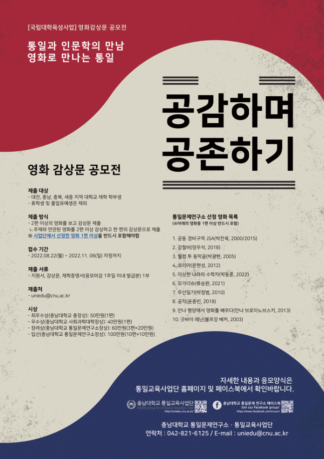 “통일과 인문학의 만남 – 영화로 만나는 통일” 영화 감상문 공모전: (~11/6) _ https://linkareer.com/activity/101980