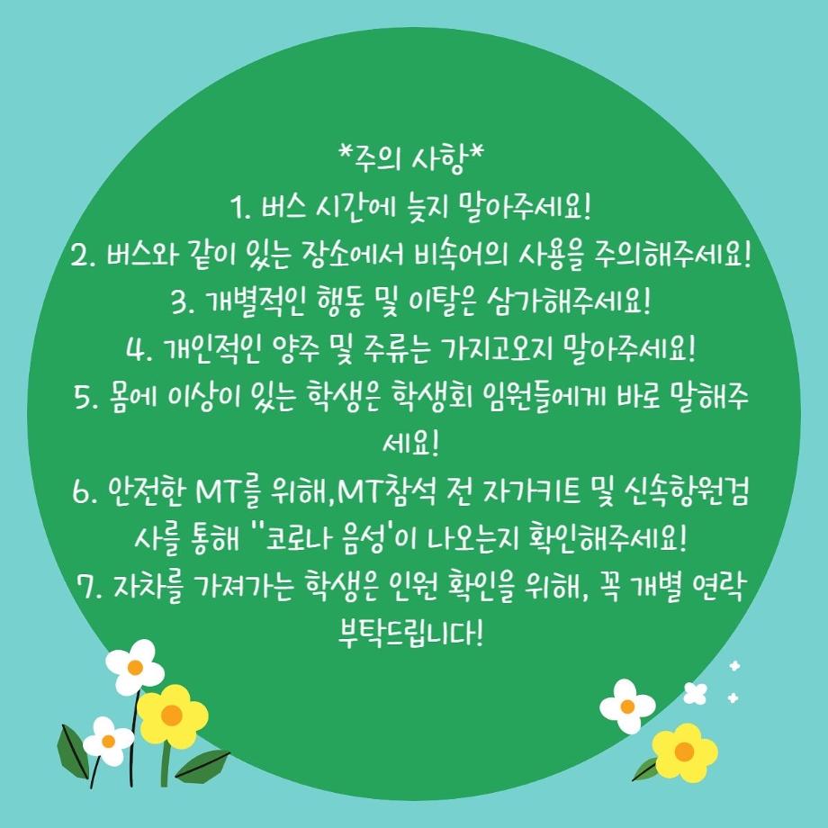 다 함께 친해지고 학과의 결속력을 높이기 위한 의도를 가지고 시작한 MT이며, 코로나19 이후 처음 진행되는 MT이기에 학회에서도 즐거운 시간이 될 수 있도록 노력하였으니, 모두들 행사 진행에 적극적으로 참여해 즐거운 엠티가 되었으면 좋겠습니다 😁