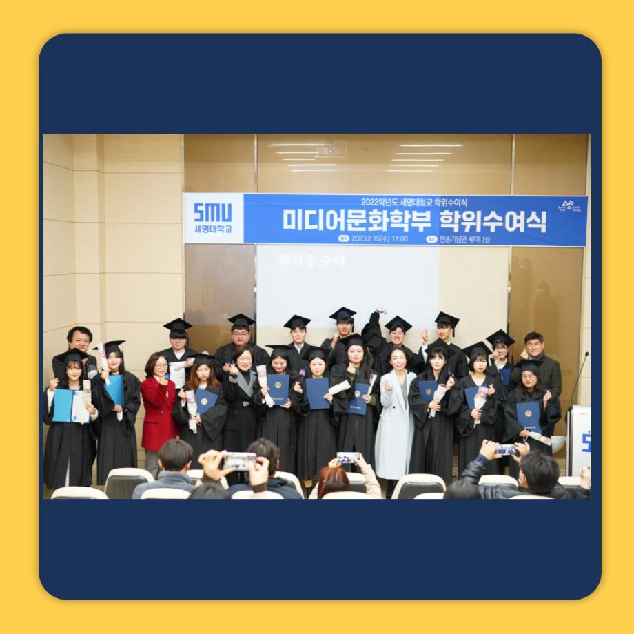 본문 시작 홈으로 학부소식 학부소개 교육과정 학부소식 커뮤니티 홈페이지가이드 학부행사 공지사항 학사일정 학부행사 미문뉴스 미문한컷 포토갤러리 학부행사 페이스북 트위터 프린트 [2월의 행사] 제29회 학위수여식 미디어문화학부 3123 2023-03-09 2023년 2월 15일, 2022학년도 미디어문화학부 학위수여식을 진행하였습니다. 선배님들의 학위수여식을 보니 저까지 아쉬운 마음이 들었습니다. 새로운 출발을 하시는 선배님들의 앞길이 항상 꽃길만 가득 차 있기를 저희 미디어 문화학부가 응원하겠습니다! 다시 한번 진심으로 졸업을 축하드립니다! 목록 이전미디어문화학부 학술제 어울림 '다시, 새롭게' 다음 [2월의 행사] 세명대학교 미디어문화학부 꿈설계학기 담당부서 : 미디어문화학부 담당자 : - 연락처 : 043-649-1760 최종수정일 : 2024-10-26 만족도조사 만족도 조사 이 페이지에서 제공하는 정보에 대하여 만족하시나요? 매우만족 만족 보통 불만족 매우불만족