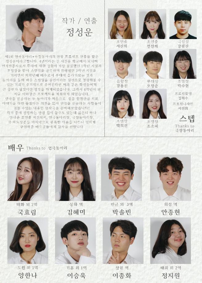 본문 시작 홈으로 커뮤니티 학과소개 교수소개 학과과정 커뮤니티 작품DB 서울대학로 민송아트홀 홈페이지가이드 사진자료실 학과공지 전공자료실 사진자료실 사진자료실 페이스북 트위터 프린트 [공연영상학과] 제1회 극동/연동 합동 프로젝트 "이름에게" 공연영상학과 6420 2019-06-07 작가/연출 : 정성운 조연출 : 서진희, 전진희 극장장 : 강필진 음향장 : 강용진 무대장 : 오창준 조명장 : 박수현, 박희진, 조소혜 프로필촬영 : 김희수 프로필디자인 : 서진희 '태화'외 7역 : 국효림 '상화' 역 : 김혜미 '민규'외 3역 : 박솔빈 '희성' 역 : 안종현 '도원'외 1역 : 양한나 '기훈'외 1역 : 이승욱 '상현' 역 : 이종화 '태희'외 2역 : 정지원 Thanks to, 극장동아리/연극동아리 목록 이전[공연영상학과] 2019 성년의 날 다음 [공연영상학과] 2019년 1학기 뮤지컬제작실습 "지하철 1호선" 담당부서 : 공연영상학과 담당자 : - 연락처 : 043-649-1429 최종수정일 : 2024-10-26 만족도조사 만족도 조사 이 페이지에서 제공하는 정보에 대하여 만족하시나요? 매우만족 만족 보통 불만족 매우불만족