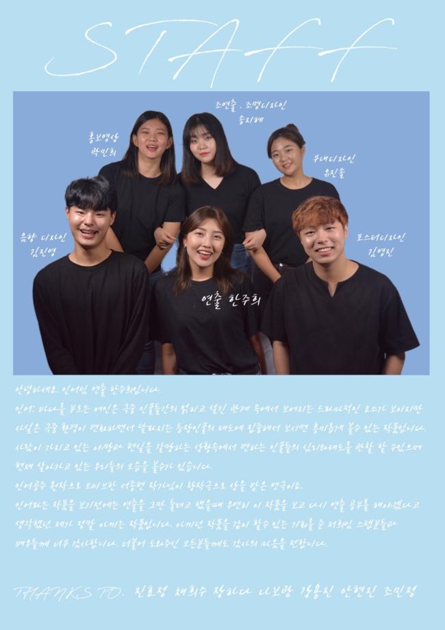 본문 시작 홈으로 커뮤니티 학과소개 교수소개 학과과정 커뮤니티 작품DB 서울대학로 민송아트홀 홈페이지가이드 사진자료실 학과공지 전공자료실 사진자료실 사진자료실 페이스북 트위터 프린트 [공연영상학과] 하계프로젝트 " 인어;바다를 부르는 여인 " 공연영상학과 5754 2019-10-15 연출 : 한주희 조연출 : 송지혜 배우 : 원성준, 임현자, 김수영, 이종화 무대디자인 : 유진솔 조명디자인: 송지혜 음향디자인: 김진영 포스터디자인: 김영진 홍보영상 : 곽민희 목록 이전[공연영상학과] 영상장비교육 다음 [공연영상학과] 2019학년도 졸업영화제 '어쩌다 졸업,' 담당부서 : 공연영상학과 담당자 : - 연락처 : 043-649-1429 최종수정일 : 2024-10-26 만족도조사 만족도 조사 이 페이지에서 제공하는 정보에 대하여 만족하시나요? 매우만족 만족 보통 불만족 매우불만족