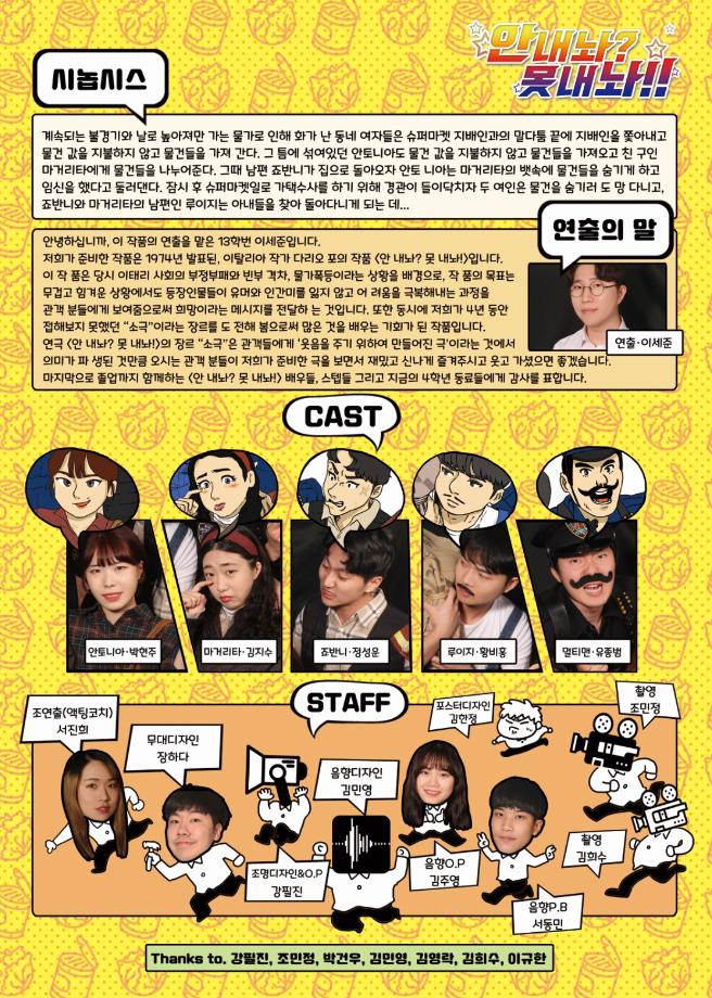 본문 시작 홈으로 커뮤니티 학과소개 교수소개 학과과정 커뮤니티 작품DB 서울대학로 민송아트홀 홈페이지가이드 사진자료실 학과공지 전공자료실 사진자료실 사진자료실 페이스북 트위터 프린트 [공연영상학과] 개인프로젝트 "안내놔? 못내놔!" 공연영상학과 7250 2019-12-05 연출 : 이세준 조연출(액팅코치) : 서진희 CAST : 박현주, 김지수, 정성운, 황비홍, 유종범 무대디자인 : 장하다 조명디자인/O.P : 강필진 음향디자인 : 김민영 음향 O.P : 김주영 음향 B.P : 서동민 포스터디자인 : 김한정 영상촬영 : 김희수, 조민정 목록 이전[공연영상학과] 2019-2학기 농가일손돕기 체험 다음 [공연영상학과] 2019년 2학기 뮤지컬제작실습 "사랑 꽃" 담당부서 : 공연영상학과 담당자 : - 연락처 : 043-649-1429 최종수정일 : 2024-10-26 만족도조사 만족도 조사 이 페이지에서 제공하는 정보에 대하여 만족하시나요? 매우만족 만족 보통 불만족 매우불만족
