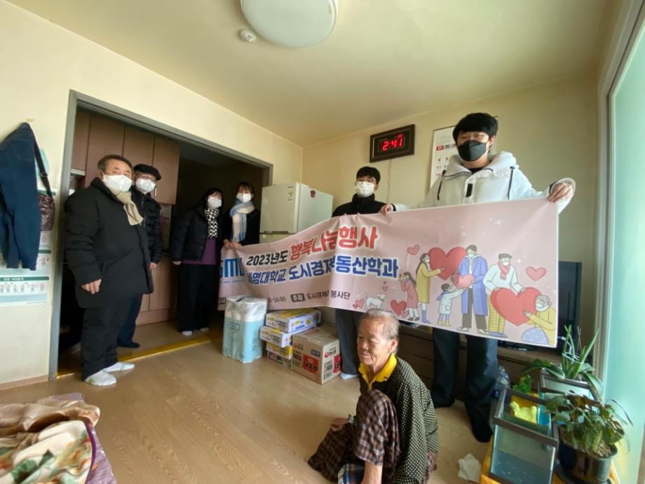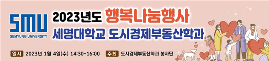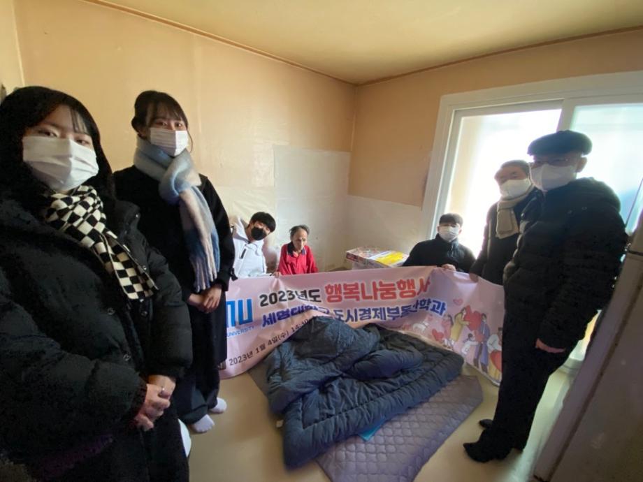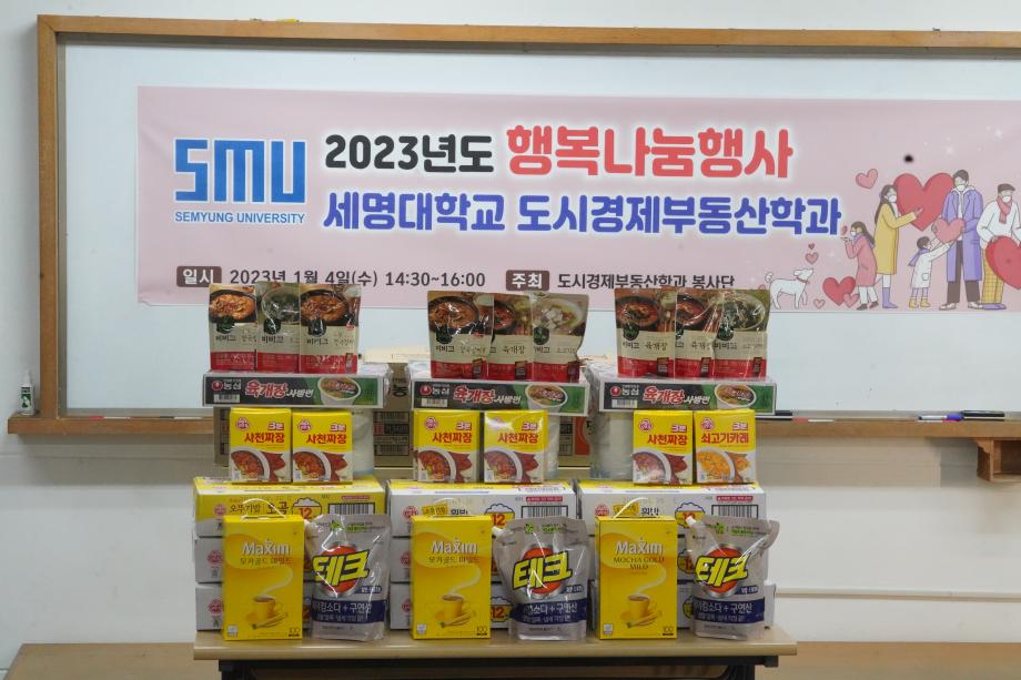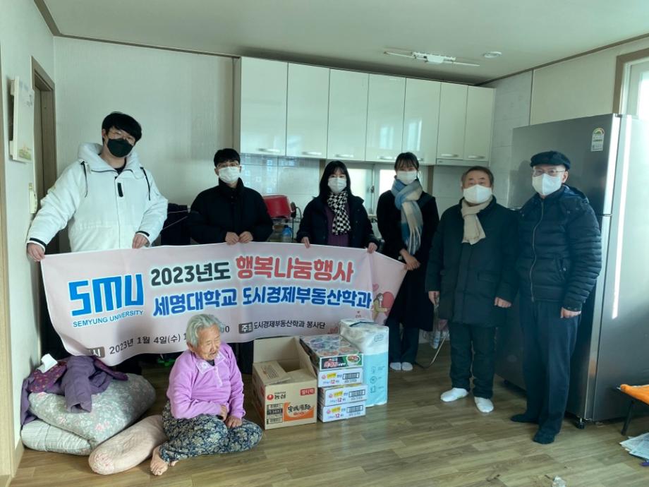 2023년 1월 4일 세명대학교 (총장권동현)의 도시경제부동산학과 학생회 및 교수일동은 제천지역 하소동, 송학면 지역 독거노인을 대상으로 행복나눔행사를 진행했습니다.