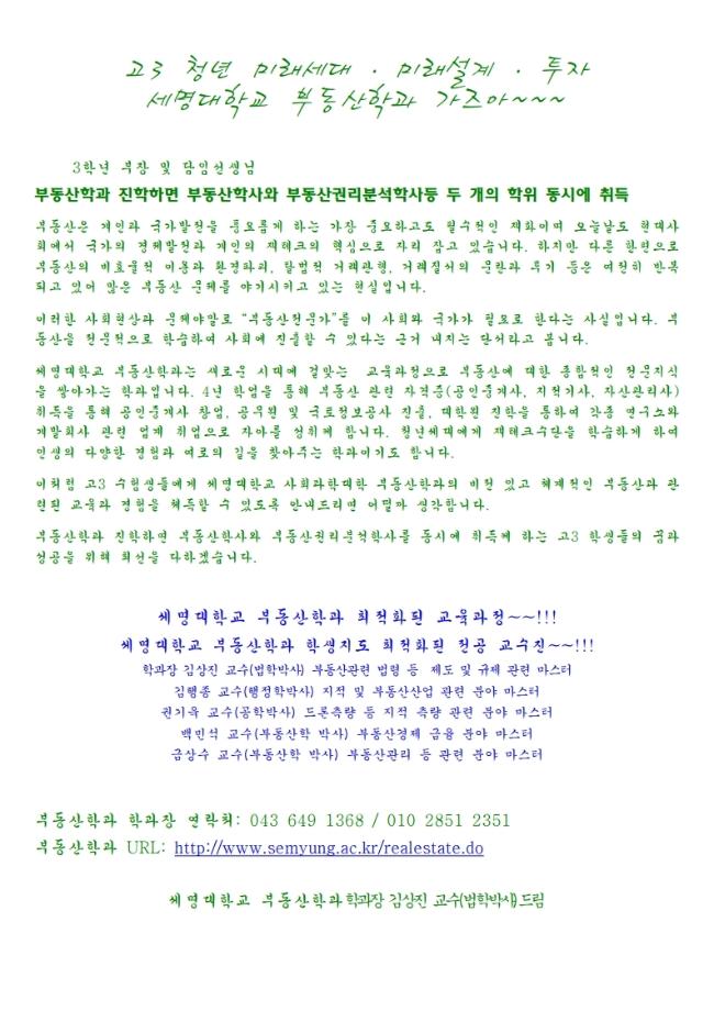 본문 시작 홈으로 학과 소식 학과소개 취업 및 진로 언론 및 보도 학과 소식 대학원 홈페이지가이드 행사사진게시판 행사사진게시판 공지사항 일반자료실 강의자료실 부동산학보 동아리 행사사진게시판 페이스북 트위터 프린트 세명대학교 부동산학과 수시 입시자료 부동산학과 6304 2020-09-21 세명대학교 홈페이지에 있는 2021학년도 세명대학교 수시 입시자료입니다. 2021년도 입시에서 세명대학교 진학을 희망하는 예비 신입생, 부모님, 선생님 및 관심 있으신 분들께서는 참조해주시면 감사드리겠습니다. 목록 이전제 5 회 공간정보 활용 창업 아이디어 공모전 다음 LH, '남북교류와 미래 국토비전' 작품 공모전 개최 담당부서 : 부동산지적학과 담당자 : - 연락처 : 043-649-1784 최종수정일 : 2024-10-26 만족도조사 만족도 조사 이 페이지에서 제공하는 정보에 대하여 만족하시나요? 매우만족 만족 보통 불만족 매우불만족