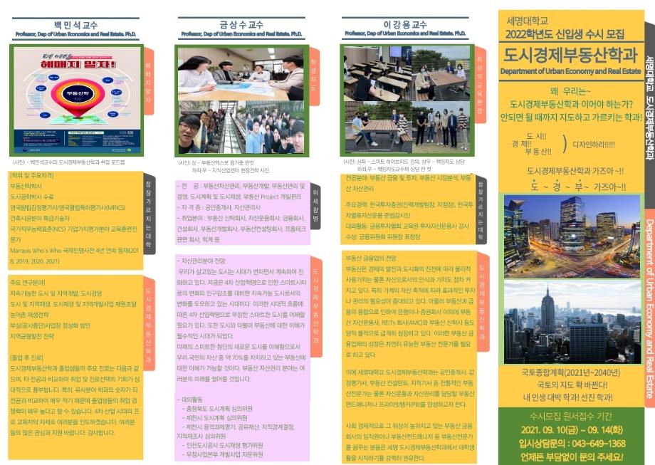 본문 시작 홈으로 학과 소식 학과소개 취업 및 진로 언론 및 보도 학과 소식 대학원 홈페이지가이드 행사사진게시판 행사사진게시판 공지사항 일반자료실 강의자료실 부동산학보 동아리 행사사진게시판 페이스북 트위터 프린트 학과명칭 변경 도시경제부동산학과 홍보리플렛 부동산학과 3570 2021-06-16 세명대학교 부동산학과가 2022학년도 '도시경제부동산학과'로 새롭게 탄생합니다. 세명대학교 부동산학과가 2022년 '도시경제부동산학과'로 새롭게 탄생합니다. 격변하는시대에 맞춰 전문적이고 수준높은 교육을 위하여 도시경제부동산학과가 여러분들과 함께 할 것입니다. 작성자 : 부동산학과 조교 목록 이전학과장님과 다빈학생회! 다음 한국법이론실무학회활동하는 도경제부동산학과 김상진교수 담당부서 : 부동산지적학과 담당자 : - 연락처 : 043-649-1784 최종수정일 : 2024-10-26 만족도조사 만족도 조사 이 페이지에서 제공하는 정보에 대하여 만족하시나요? 매우만족 만족 보통 불만족 매우불만족