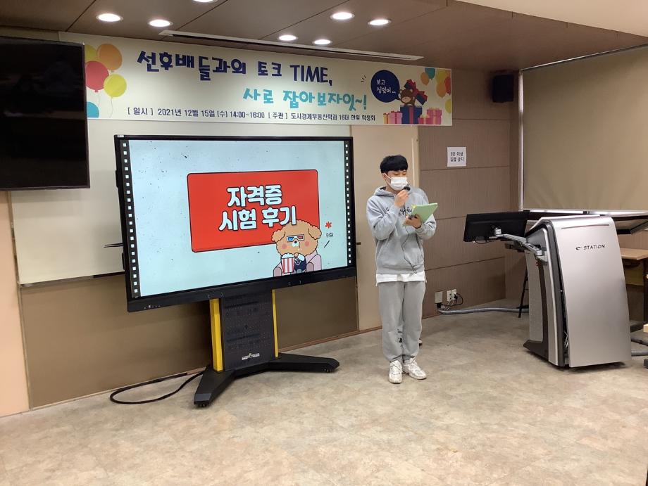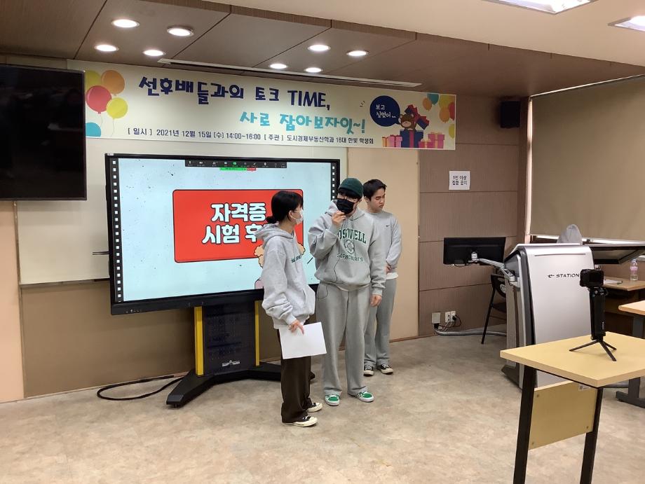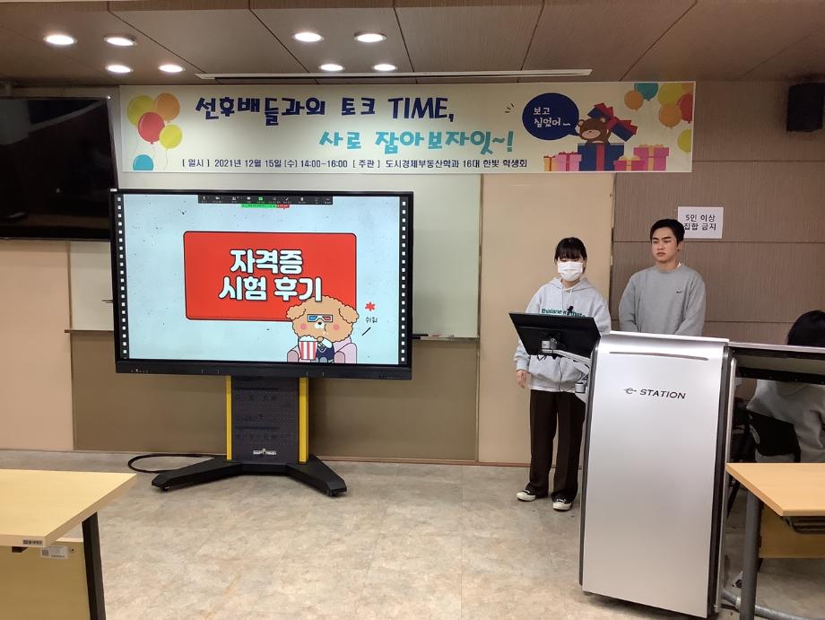 제 16대 한빛 학생회 첫 공식적 행사를 진행을 했습니다. 코로나 여파로 인한 제대로된 학교 생활을 못한 1학년, 2학년을 대상으로 후배와 선배간의 관계를 한층 더 높일 수 있는 자리를 마련해봤습니다. 또한 이번년도 자격증 취득한 학생들의 시험 후기 및 자격증을 공부하는 방법을 알려주는 자리도 있었습니다. 이런 자리로 인해 도시경제 부동산 학과의 분위기와 과 관련의 자격증 및 공부하는 방법을 후배들에게 잘 전달되는 자리가 되었습니다. 당일 행사는 비대면으로 진행하여 코로나 확산으로 대학생활의 어려움이 있었으나 학생들의 적극적인 참여가 있어서 행사 진행에 있어서 한층 더 수월함에 있었습니다.