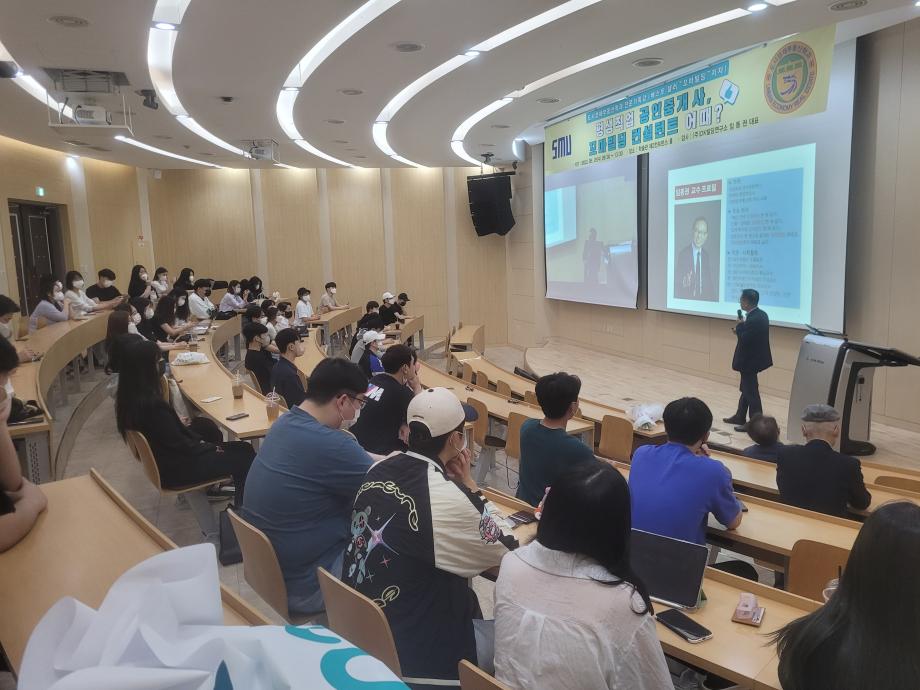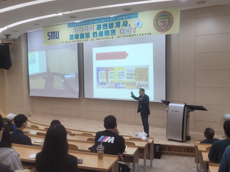 * 내용 : DK빌딩연구소 임동권 대표님께서 도시경제 부동산학과 학생들을 위해 공인중개사의 비전과 꼬마빌딩 중개에 대한 실무영역과 직업소개 특강을 해주셨습니다. 해가 거듭할 수 록 공인중개사 자격증에 대한 가치 상승에 대한 이유와 부동산 중개 구조, 실무, 꼬마빌딩 중개의 장점, 실제 꼬마빌딩 중개 케이스를 설명해 주시며 수익구조에 대하여 자세하게 강의해 주셨습니다. 학생들은 전문가로서 자격 취득을 위해 매년 노력하고 있습니다. 공인중개사 자격증 취득으로 큰 수익을 낼 수 있는 전문직의 길에 도전하는 학생들에게 의미 있는 시간이었습니다.