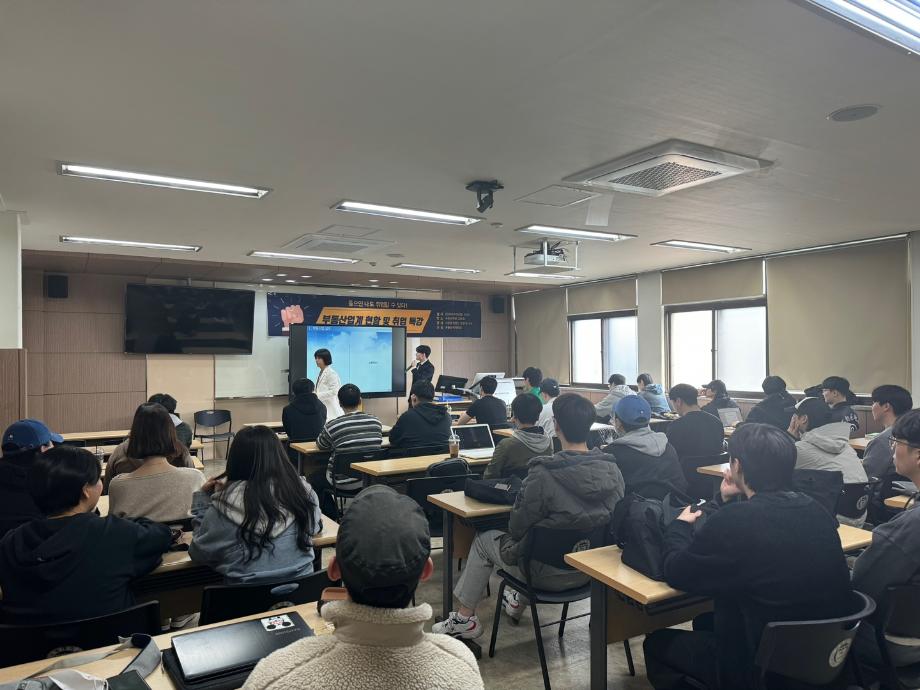 내용 : 이촌회계법인 강문희 강사님은부동산자산관리실무체험 에 특강을 해주셨습니다. 학교에서 배우기 어려운 부동산업계 현황 및 취업특강을 구체적으로 설명을 해주셨습니다. 학생들은 부동산분야의 진로에 깊이 고민하고 답을 얻는 시간이였다고 생각합니다.