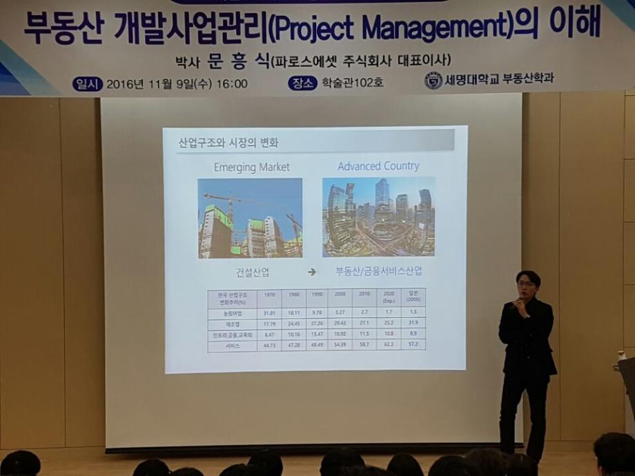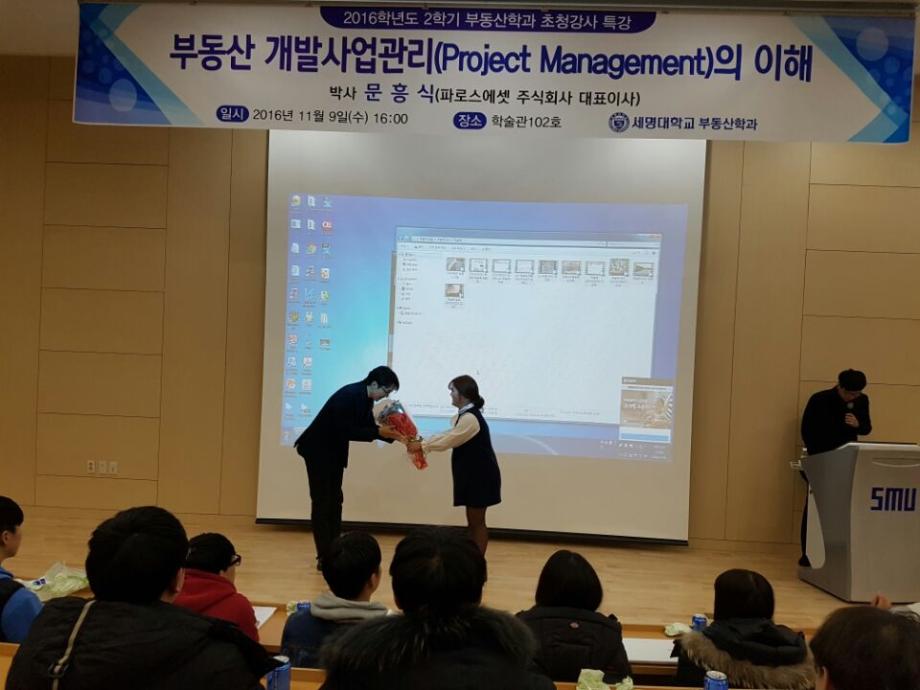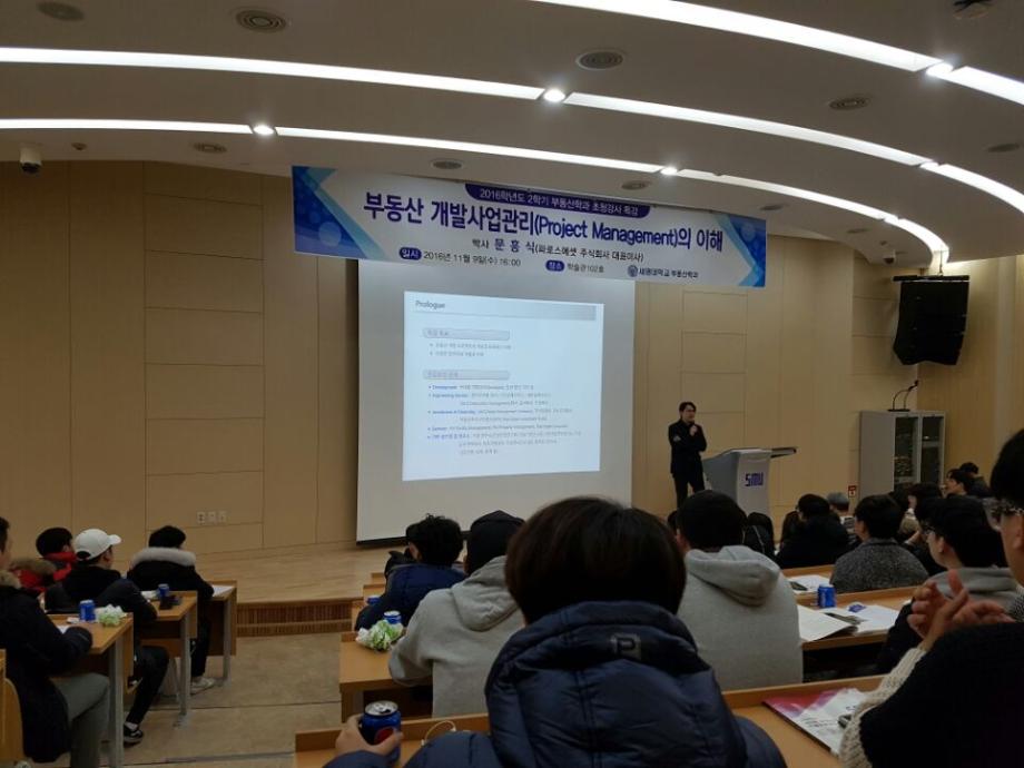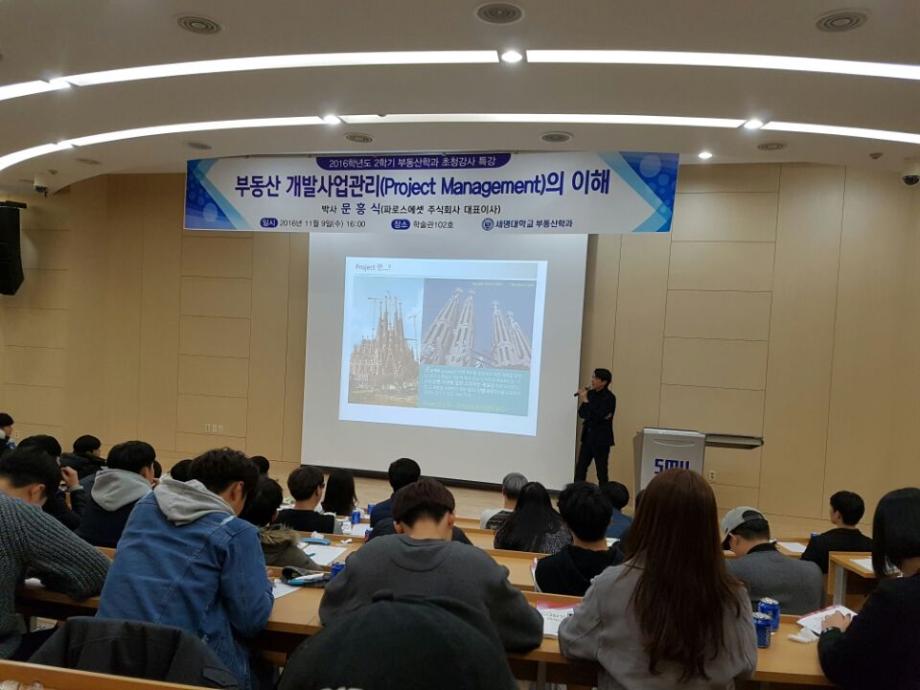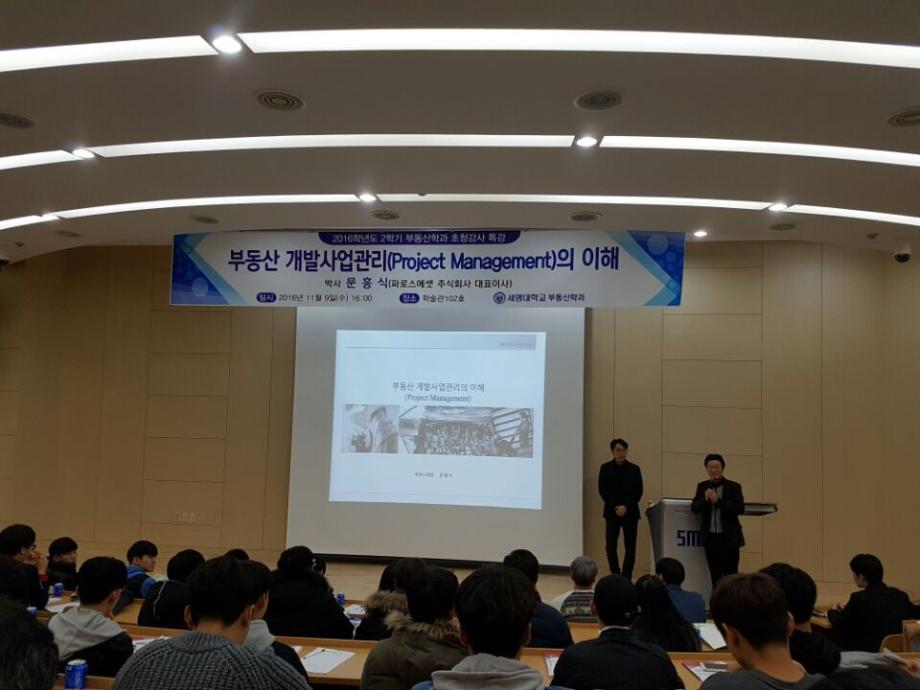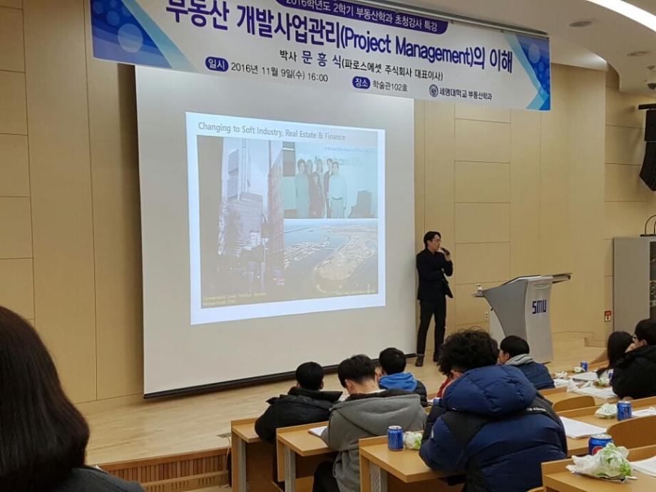 세명대학교 부동산학과(학과장 권기욱교수)는 2016년 11월 9일(수) 세명대학교 학술관 102호에서 파로스에셋 주식회사 대표이사인 문흥식박사를 초청하여 ‘부동산 개발사업관리(Project Management)의 이해’란 주제로 특강을 실시하였다.