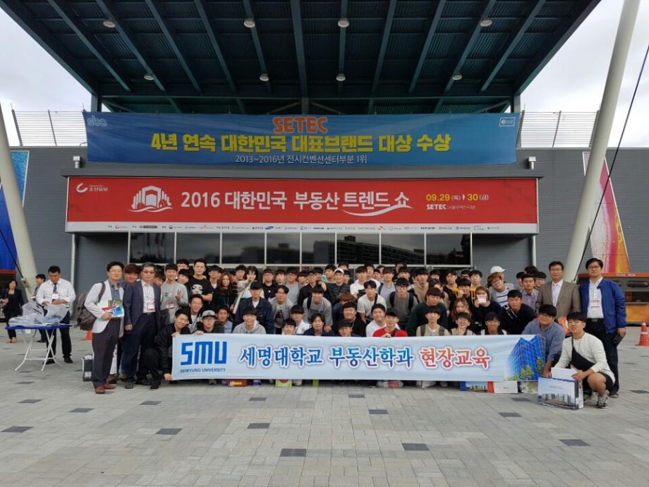 지난 2016년 9월 29일(목) 부동산학과는 학과교수 4명, 재학생 120여명이 조선일보가 SETEC에서 개최한 “2016 대한민국 부동산 트랜드쇼”에 현장견학체험을 다녀왔다. 이날 행사는 9월 29일부터 9월 30일 양일동안 개최되었으며, 4개의 전시관을 통해 부동산관련 분야 및 금융 Zone, 부동산분야별 전문가 세미나 및 토크쇼, 국토교통 신산업 전시회 및 건설인재 채용설명회 등 다양한 이벤트로 구성이 되어 진행 되었다. 견학을 통해 학생들은 현재의 부동산시장의 트랜드를 경험할 수 있었으며, 채용설명회를 통한 미래의 취업 방향설정 등 유익한 시간을 가졌다.