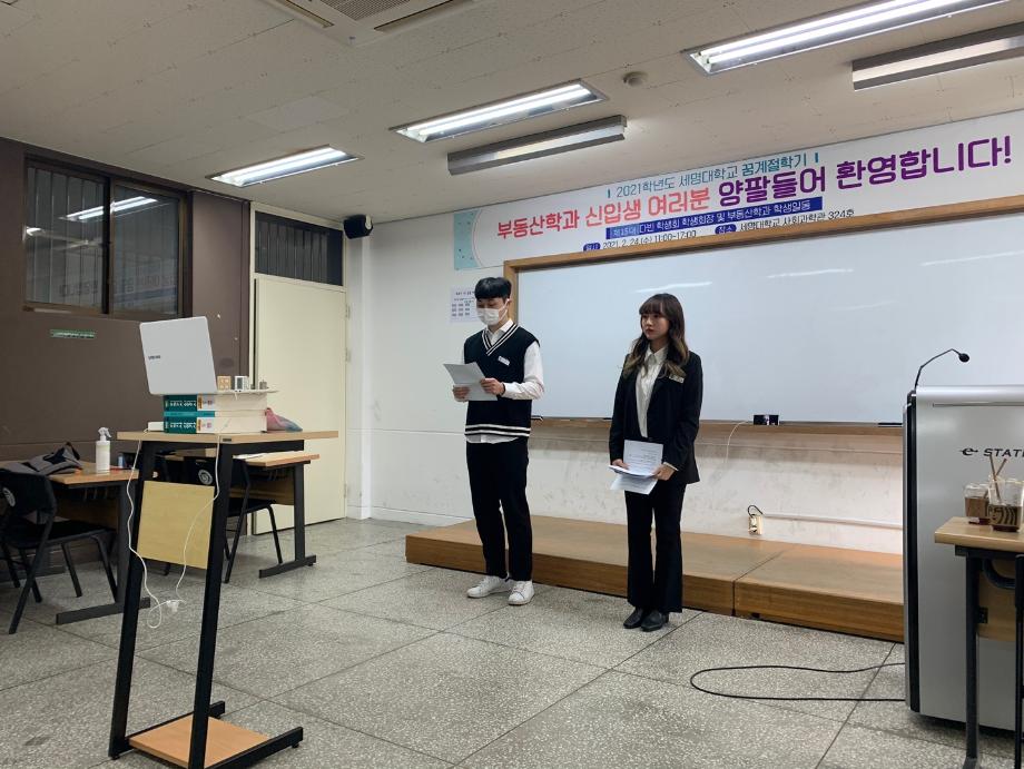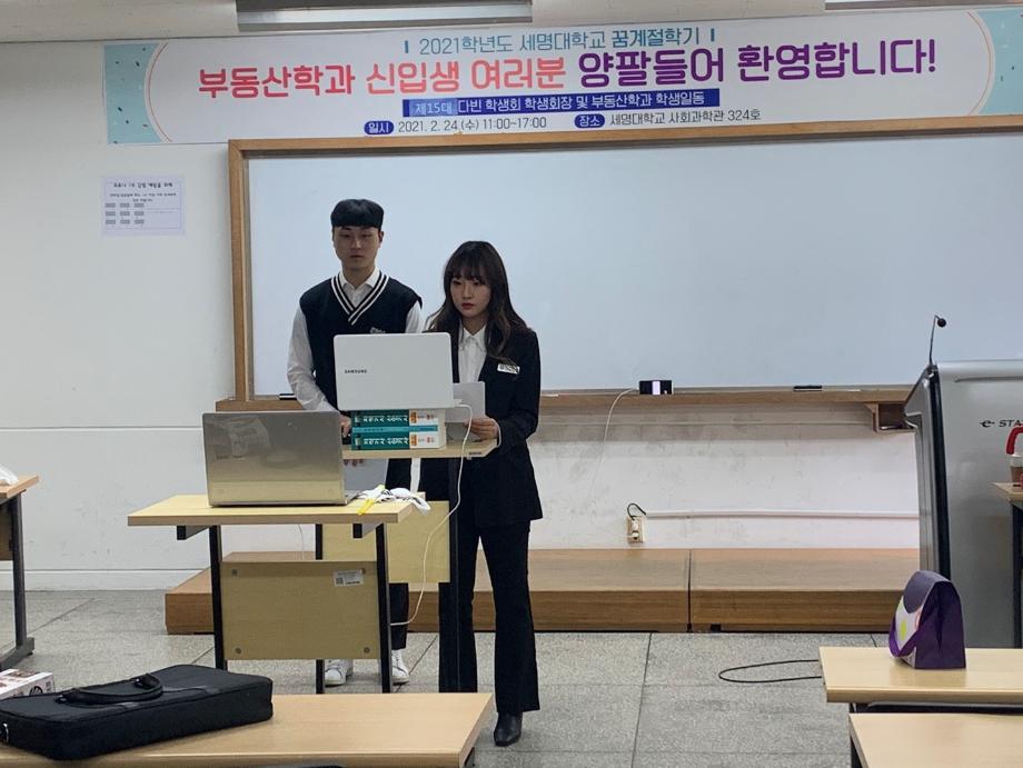 부동산학과에서 2021학년도 신입생 꿈 설계학기를 비대면으로 진행하였습니다. 코로나로 인하여 신입생들이 학교에 적응하기 위한 프로그램을 진행하기 어렵기에 비대면으로 실시하였습니다. ZOOM을 활용하여 신입생들은 각자의 장소에서 참여하였고 학생회 임원들은 행사를 위하여 리허설까지 하며 신입생들을 반기는데 최선을 다했습니다. 학생들은 학교에관한 안내사항과 학과소개 및 전공 특강을 들으며 부동산학과대하여 이해하였습니다. 하루빨리 학생들이 학교에 오는 날을 고대하고 있습니다.