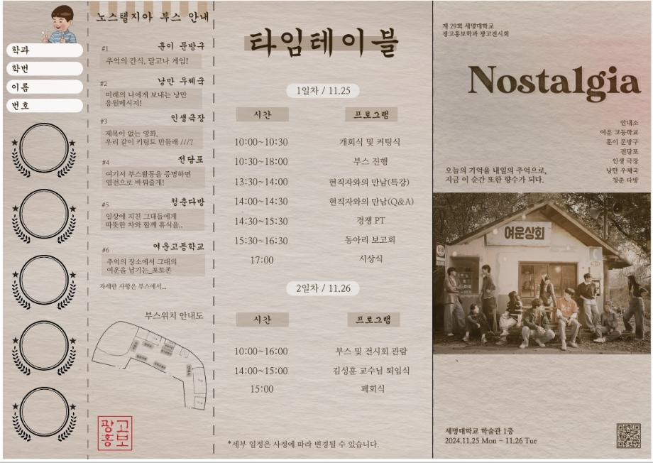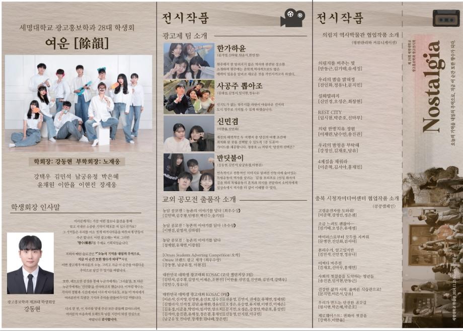 본문 시작 홈으로 특별CC프로그램 매력적인 학과소개 흥미로운 교육과정 특별CC프로그램 We can 취업 따뜻한 커뮤니티 홈페이지가이드 광고전시회 광고전시회 광고영상 제작실습 광고디자인 자격증취득 C&E(도전!경험!) 작품 작품 활동 작품 페이스북 트위터 프린트 [2024년도]제29회 광고전시회 광고홍보학과 3953 2024-12-04 제29회 광고전시회 노스탤지아 목록 이전[2023년도]제28회광고전시회 다음 [2025년도]제30회광고전시회