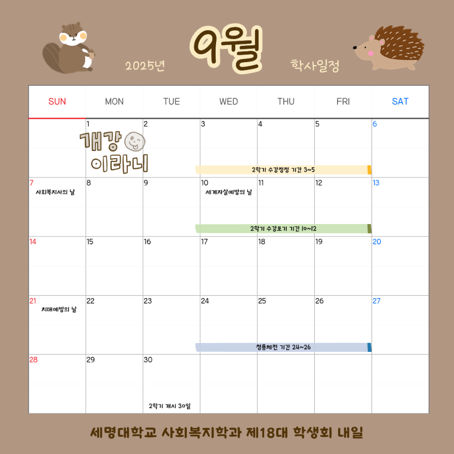 본문 시작 홈으로 커뮤니티 학과소개 교수소개 교육과정 현장실습 및 취업정보 커뮤니티 홈페이지가이드 학사일정 학과공지 학사일정 학생회 동아리 학생 소통 광장 포토갤러리 전공자료실 서식자료실 학사일정 페이스북 트위터 프린트 9월 학사 일정 사회복지학과 804 2025-09-04 2025학년도 9월 학사 일정입니다. 목록 이전8월 학사 일정 다음 10월 학사 일정 담당부서 : 사회복지학과 담당자 : - 연락처 : 043-649-1799 최종수정일 : 2024-10-26 만족도조사 만족도 조사 이 페이지에서 제공하는 정보에 대하여 만족하시나요? 매우만족 만족 보통 불만족 매우불만족