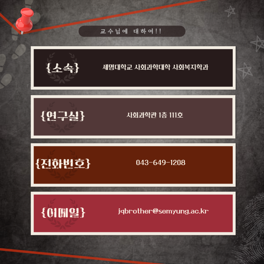 본문 시작 홈으로 커뮤니티 학과소개 교수소개 교육과정 현장실습 및 취업정보 커뮤니티 홈페이지가이드 학생 소통 광장 학과공지 학사일정 학생회 동아리 학생 소통 광장 포토갤러리 전공자료실 서식자료실 학생 소통 광장 페이스북 트위터 프린트 세명대학교 사회복지학과 정규형 교수님 알아보기 편 사회복지학과 2966 2023-03-07 '세명대학교 사회복지학과 정규형 교수님 알아보기 편' 입니다. 목록 이전세명대학교 사회복지학과 노법래 교수님 알아보기 다음 세명대학교 사회복지학과 유용식교수님이 애장하는 것은? 담당부서 : 사회복지학과 담당자 : - 연락처 : 043-649-1799 최종수정일 : 2024-10-26 만족도조사 만족도 조사 이 페이지에서 제공하는 정보에 대하여 만족하시나요? 매우만족 만족 보통 불만족 매우불만족