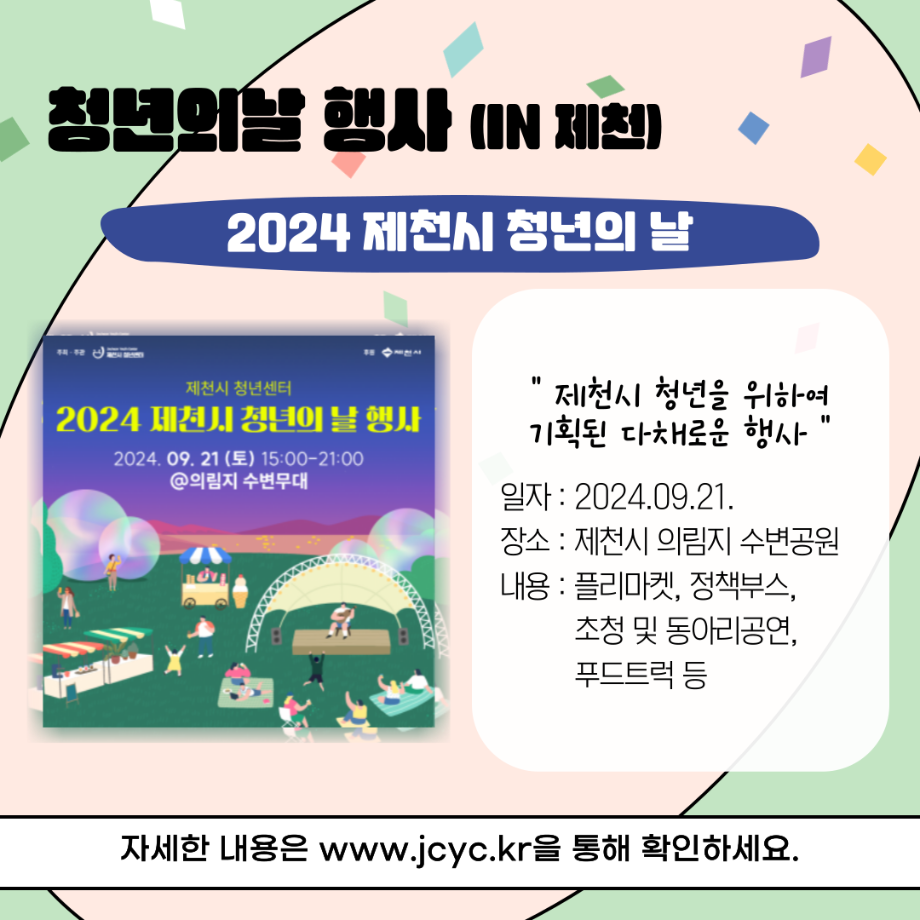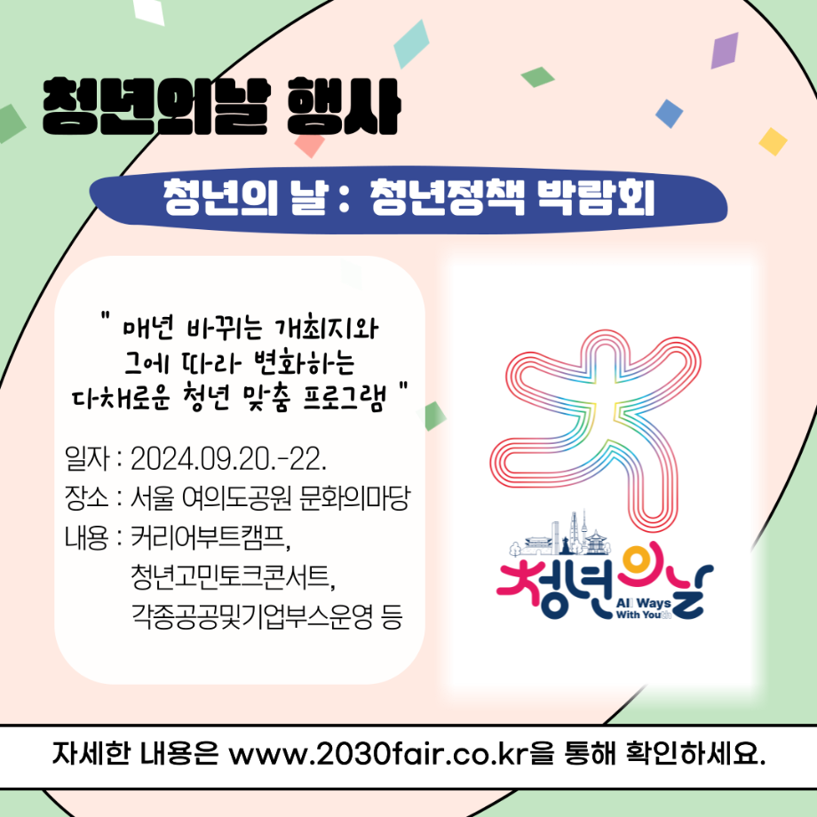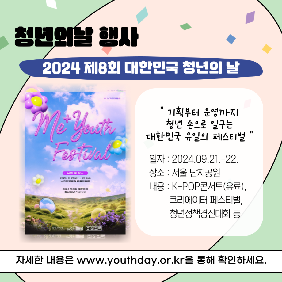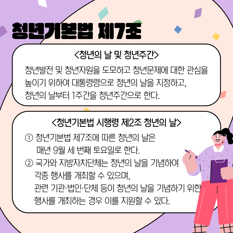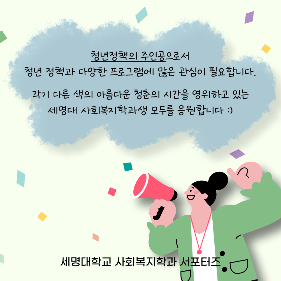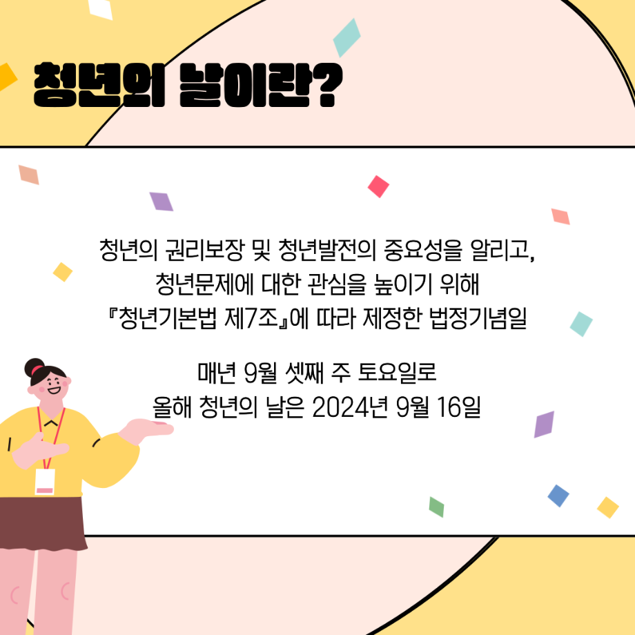 본문 시작 홈으로 커뮤니티 학과소개 교수소개 교육과정 현장실습 및 취업정보 커뮤니티 홈페이지가이드 학생 소통 광장 학과공지 학사일정 학생회 동아리 학생 소통 광장 포토갤러리 전공자료실 서식자료실 학생 소통 광장 페이스북 트위터 프린트 세명대학교 사회복지학과 청년의 날 홍보 사회복지학과 3056 2024-09-21 매년 9월 셋째주 토요일은 『청년기본법 제7조』에 따라 청년의 권리 증진과 문제 해결을 통한 발전을 위해 제정된 '청년의날'입니다 🎉 다양한 청년 정책이 개발되고 발전할 수 있도록 많은 관심이 필요합니다. 목록 이전세명대학교 사회복지학과 아쉬움이 남는다면 Right now 다음 세명대학교 사회복지학과 2025 교환학생 궁금하다면? 담당부서 : 사회복지학과 담당자 : - 연락처 : 043-649-1799 최종수정일 : 2024-10-26 만족도조사 만족도 조사 이 페이지에서 제공하는 정보에 대하여 만족하시나요? 매우만족 만족 보통 불만족 매우불만족