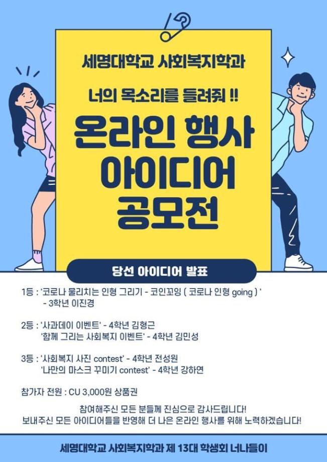 본문 시작 홈으로 커뮤니티 학과소개 교수소개 교육과정 현장실습 및 취업정보 커뮤니티 홈페이지가이드 학생 소통 광장 학과공지 학사일정 학생회 동아리 학생 소통 광장 포토갤러리 전공자료실 서식자료실 학생 소통 광장 페이스북 트위터 프린트 2020학년도 2학기 온라인행사 아이디어 공모전 사회복지학과 5688 2020-10-29 2020학년도 2학기 온라인행사 아이디어 공모전 진행사진입니다. 목록 이전2020학년도 1학기 온라인 행사(가정의 달 맞이 4행시이벤트) 다음 2020학년도 2학기 온라인행사 (사회복지의 날 기념 이벤트) 담당부서 : 사회복지학과 담당자 : - 연락처 : 043-649-1799 최종수정일 : 2024-10-26 만족도조사 만족도 조사 이 페이지에서 제공하는 정보에 대하여 만족하시나요? 매우만족 만족 보통 불만족 매우불만족