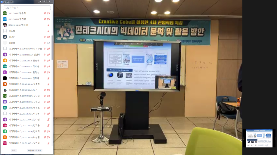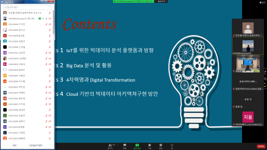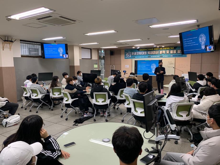 본문 시작 홈으로 학부활동 학부소개 학부활동 교육과정 커뮤니티 학부생활 입학안내 홈페이지가이드 학부갤러리 학부행사 학생회 활동 전공 동아리 학부갤러리 학부갤러리 페이스북 트위터 프린트 Creative Cube 를 활용한 4차 산업혁명 특강 컴퓨터학부 3542 2021-11-09 컴퓨터학부에서는 21.11.09(화) Creative Cube(첨단관 322호)에서 핀테크시대의 빅데이터 분석 및 활용 방안 - 교양대학 김기복 강사 의 주제로 Creative Cube 를 활용한 4차 산업혁명 특강을 진행하였습니다. 이번 특강은 대면특강 과 동시에 ZOOM을 활용한 실시간 송출을 진행하였으며 학부 학생 140명 가량이 참가하였고 성공적으로 마무리하였습니다. 목록 이전2021 한국컴퓨터종합학술대회 입상 다음 컴퓨터실무활용능력 자격증 특강 진행 담당부서 : 컴퓨터학부 담당자 : - 연락처 : 043-649-1272 최종수정일 : 2024-10-26 만족도조사 만족도 조사 이 페이지에서 제공하는 정보에 대하여 만족하시나요? 매우만족 만족 보통 불만족 매우불만족