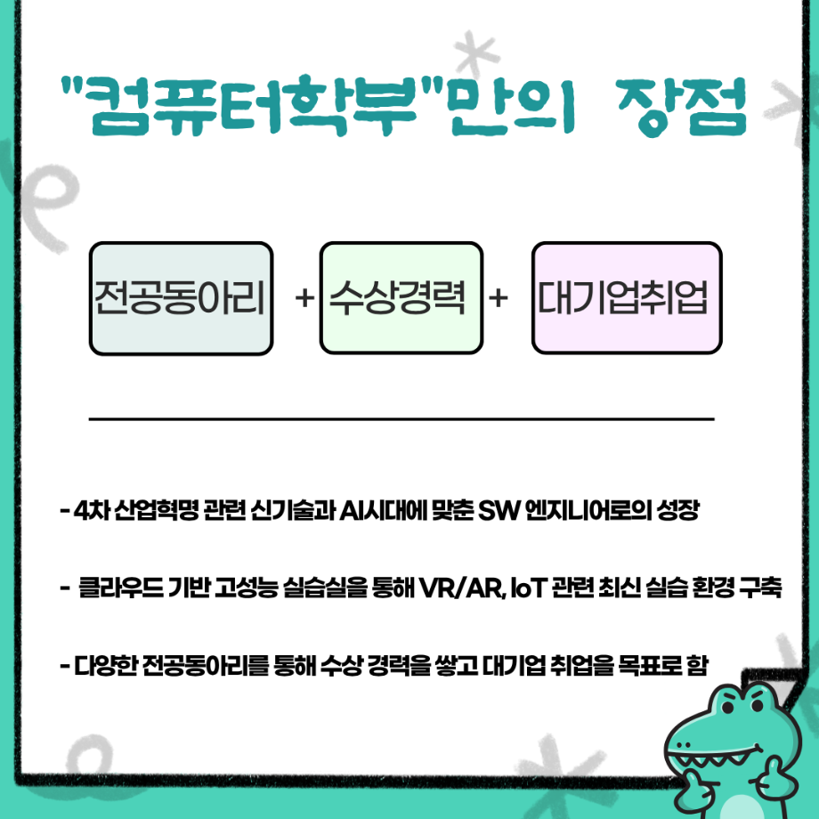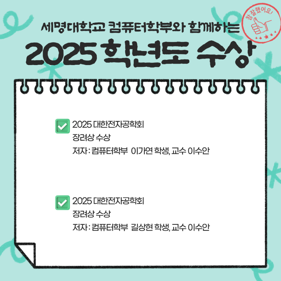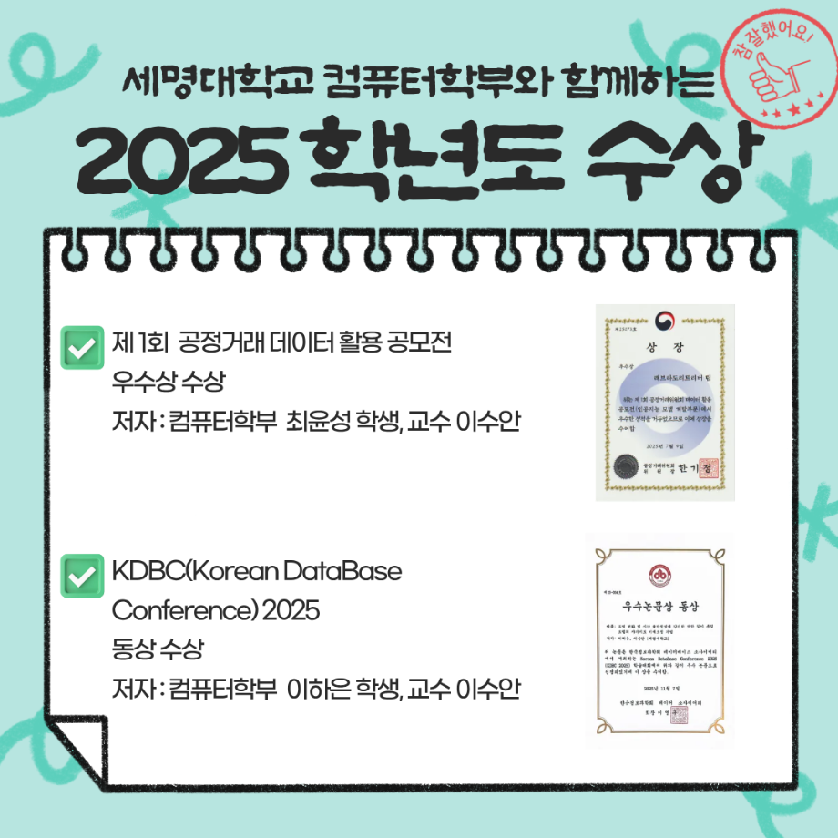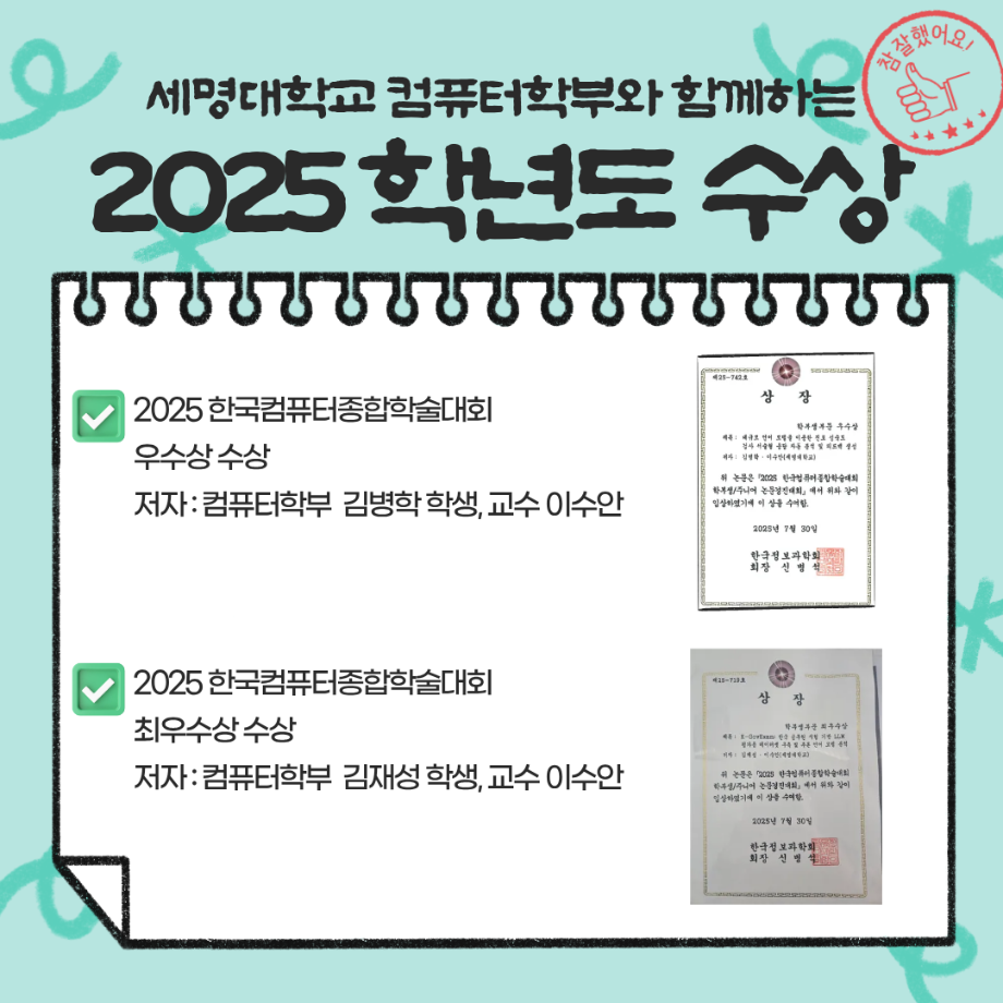 본문 시작 홈으로 학부활동 학부소개 학부활동 교육과정 커뮤니티 학부생활 입학안내 홈페이지가이드 학부갤러리 학부행사 학생회 활동 전공 동아리 학부갤러리 학부갤러리 페이스북 트위터 프린트 컴퓨터학부를 소개합니다 컴퓨터학부 1014 2025-12-30 . 목록 이전한국소프트웨어종합학술대회 (KSC2025) 다음 컴퓨터학부 이수안 교수 세계적 AI 학회 AAAI 2026 논문 채택 담당부서 : 컴퓨터학부 담당자 : - 연락처 : 043-649-1272 최종수정일 : 2024-10-26 만족도조사 만족도 조사 이 페이지에서 제공하는 정보에 대하여 만족하시나요? 매우만족 만족 보통 불만족 매우불만족