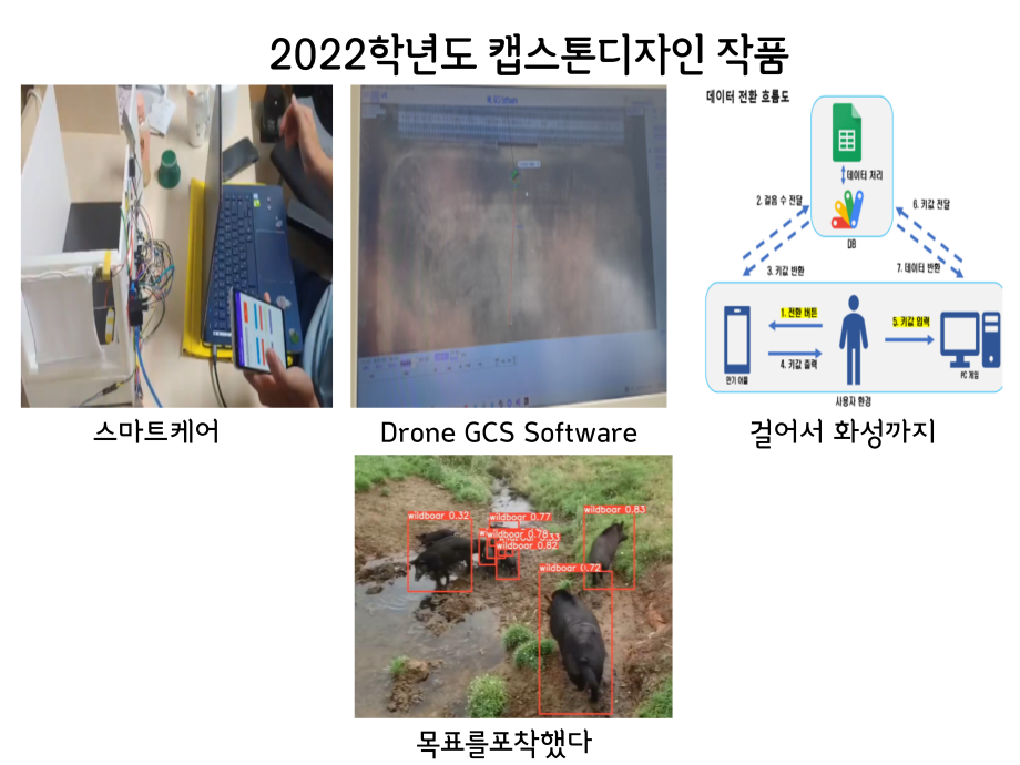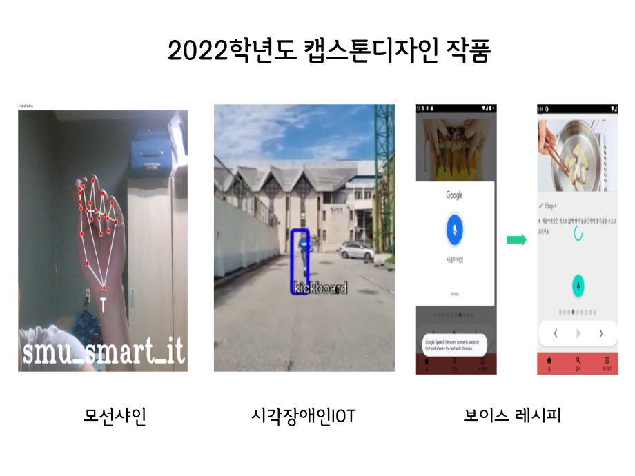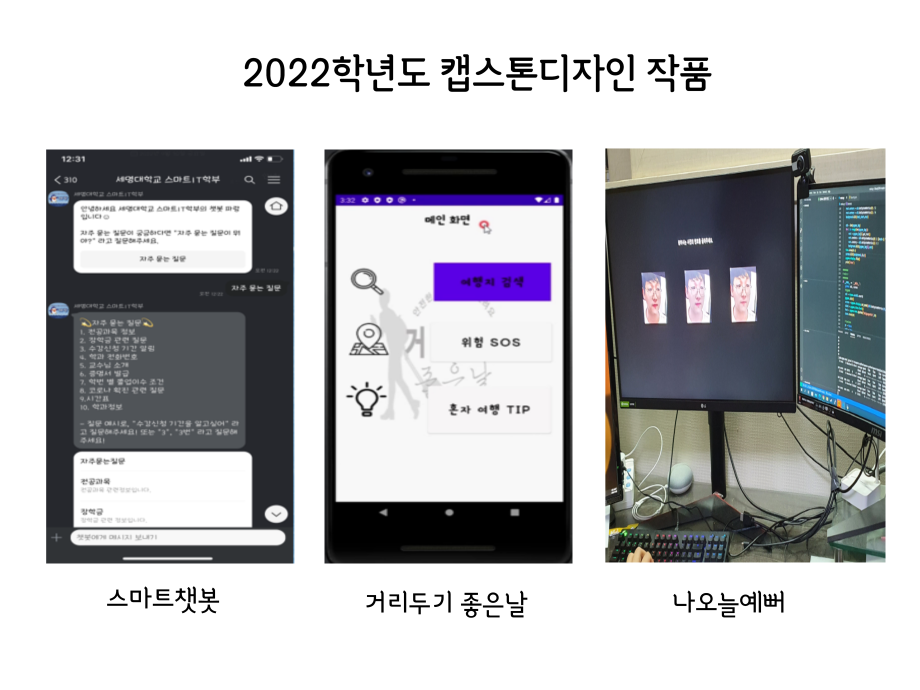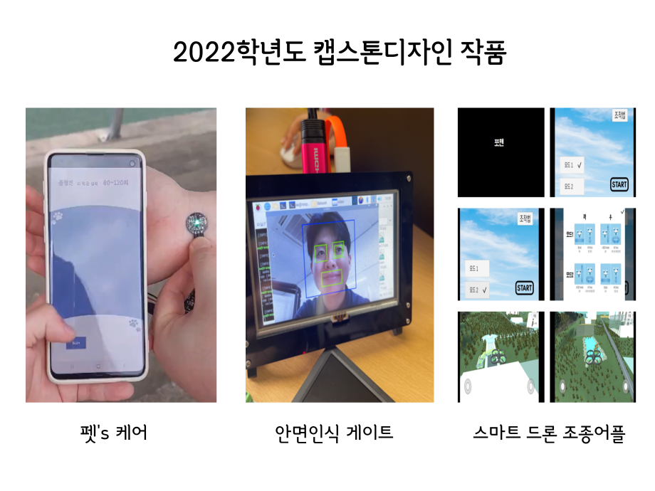 본문 시작 홈으로 SMIT 소식 SMIT 소개 SMIT 교육 SMIT 취업 SMIT 소식 SMIT 입학 홈페이지가이드 경진대회 공지사항 갤러리 경진대회 동아리 경진대회 페이스북 트위터 프린트 2022학년도 캡스톤디자인 작품 스마트IT학부 2874 2022-06-02 2022년 06월 2일 스마트IT학부는 캡스톤디자인 경진대회를 학술관1층 로비에서 진행하였습니다. 4학년 재학생들이 4년동안 학습한 지식의 마무리 단계로서 1년 동안 준비한 작품을 교수님들께 설명과 함께 시연하고 교수님들의 평가 후 우수작품을 선정하여 학술관112호에서 시상하였습니다. 캡스톤디자인 결과발표회를 통해서 재학생들은 산업현장에서 진행해야 하는 프로젝트 업무를 간접적으로 느낄 수 있는 뜻 깊은 자리 였습니다. 목록 이전2021.06.10 제22회 캡스톤디자인 전시회 다음 2022 캡스톤디자인 장려상 모션사인 담당부서 : 스마트IT학부 담당자 : - 연락처 : 043-649-1275 최종수정일 : 2024-10-26 만족도조사 만족도 조사 이 페이지에서 제공하는 정보에 대하여 만족하시나요? 매우만족 만족 보통 불만족 매우불만족