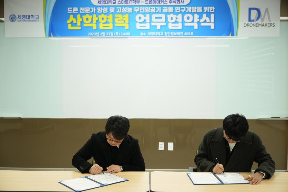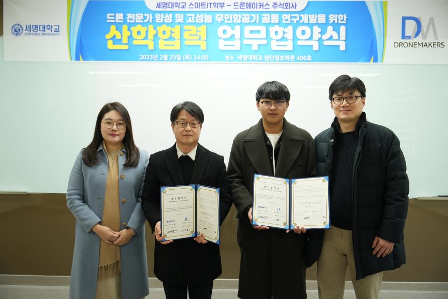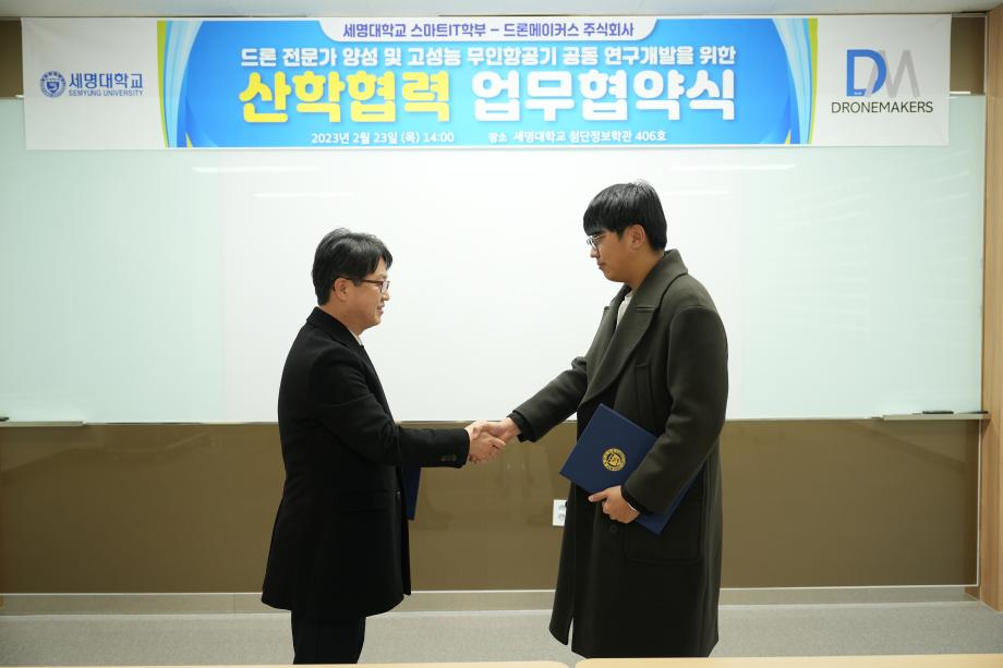 스마트IT학부는 2023년 2월 23일 제천 관내 드론 제조 전문업체인 드론메이커스와 ‘드론 전문가 양성 및 고성능 무인항공기 공동 연구개발’을 위한 산학협력 업무협약식을 진행하였다.