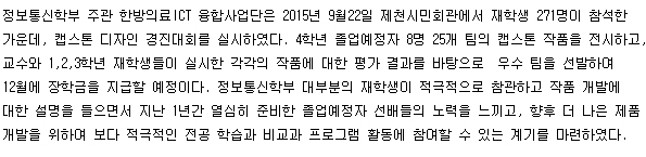 본문 시작 홈으로 SMIT 소식 SMIT 소개 SMIT 교육 SMIT 취업 SMIT 소식 SMIT 입학 홈페이지가이드 갤러리 공지사항 갤러리 경진대회 동아리 갤러리 페이스북 트위터 프린트 한방-의료ICT 융합사업단, 융합전공 동아리 오리엔테이션 진행 관리자 6221 2015-09-30 한방-의료ICT 융합사업단, 융합전공 동아리 오리엔테이션 진행 목록 이전한방-의료ICT 융합사업단, 캡스톤 디자인 경진대회 실시 다음 사물 인터넷 국제 전시회 담당부서 : 스마트IT학부 담당자 : - 연락처 : 043-649-1275 최종수정일 : 2024-10-26 만족도조사 만족도 조사 이 페이지에서 제공하는 정보에 대하여 만족하시나요? 매우만족 만족 보통 불만족 매우불만족