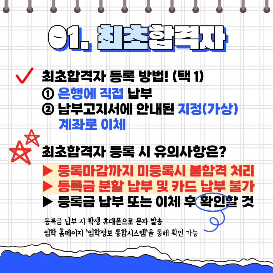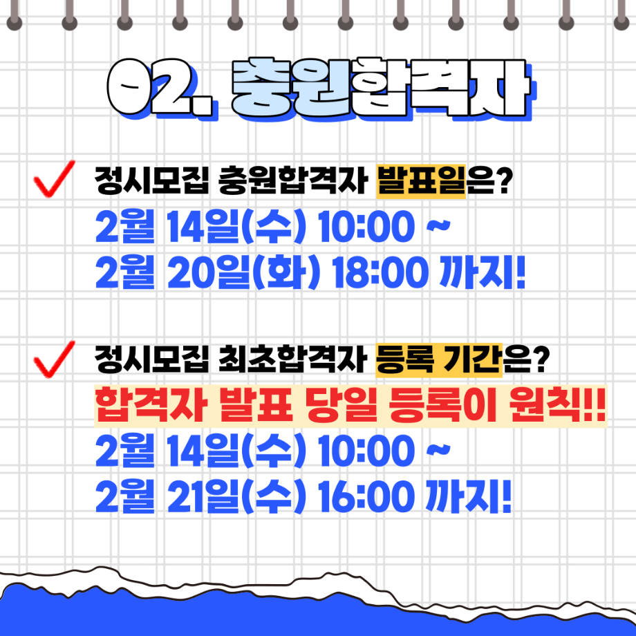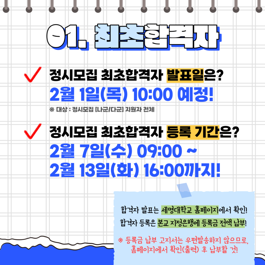 본문 시작 홈으로 SMIT 소식 SMIT 소개 SMIT 교육 SMIT 취업 SMIT 소식 SMIT 입학 홈페이지가이드 갤러리 공지사항 갤러리 경진대회 동아리 갤러리 페이스북 트위터 프린트 세명대학교 2024학년도 정시 합격자 발표 및 등록 일정 총정리💡 스마트IT학부 2795 2024-01-25 세명대학교 2024학년도 정시 합격자 발표 및 등록 일정 총정리💡 안녕하세요. 세명대학교 스마트IT학부입니다. 2024학년도 정시 합격자 발표 및 등록 일정 총정리입니다 😍 정시 발표 및 등록 일정 꼭 확인 하셔서 차질 없으시길 바랍니다. 😊 3월에 세명대학교 스마트IT학부에서 꼭 만나요🥰 목록 이전동계방학 특별활동 “정보처리기사 자격증 특강” 실시!📚 다음 2024학년도 꿈설계학기 라인업 ✨ 담당부서 : 스마트IT학부 담당자 : - 연락처 : 043-649-1275 최종수정일 : 2024-10-26 만족도조사 만족도 조사 이 페이지에서 제공하는 정보에 대하여 만족하시나요? 매우만족 만족 보통 불만족 매우불만족