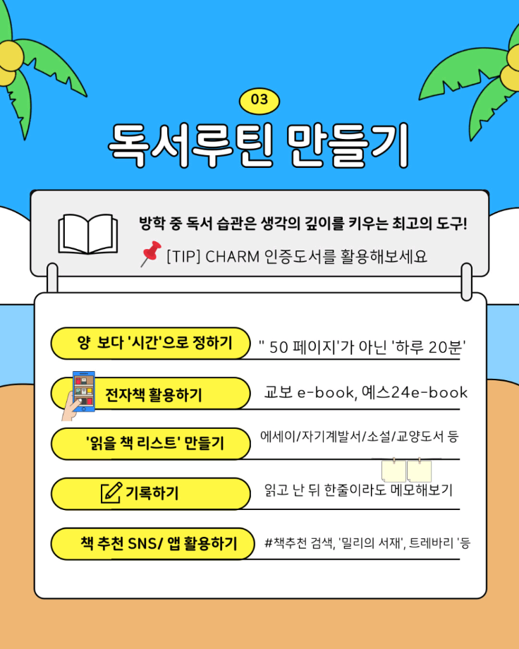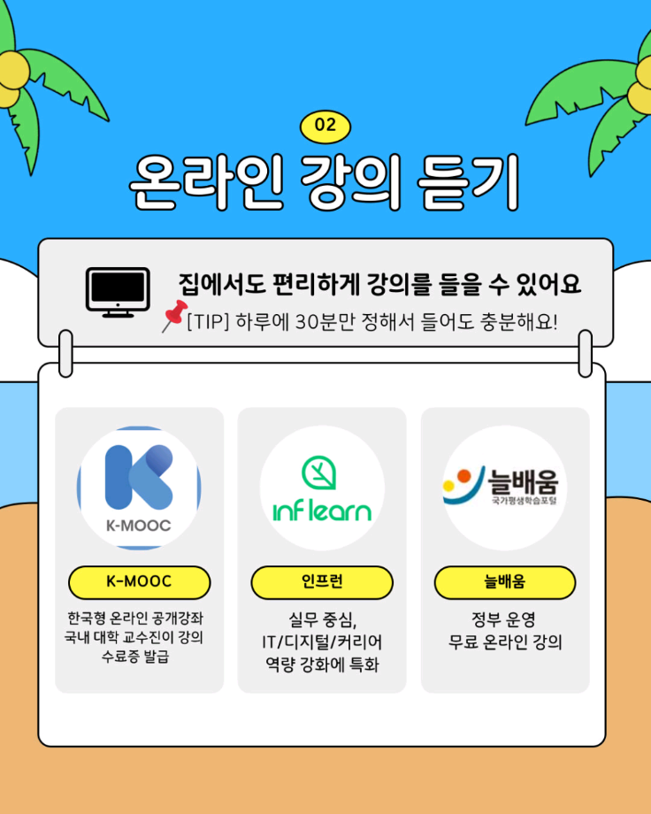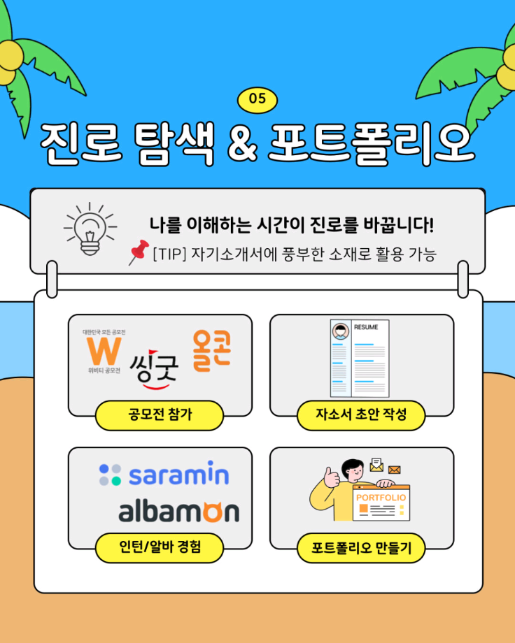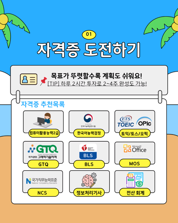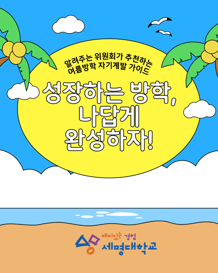 본문 시작 홈으로 SMIT 소식 SMIT 소개 SMIT 교육 SMIT 취업 SMIT 소식 SMIT 입학 홈페이지가이드 갤러리 공지사항 갤러리 경진대회 동아리 갤러리 페이스북 트위터 프린트 🌞여름방학 자기계발 가이드🏖️ 스마트IT학부 1577 2025-07-11 알려주는 위원회가 추천하는 🌞여름방학 자기계발 가이드🏖️ 📢 이번 방학, 그냥 흘려보낼 순 없죠! 자격증, 봉사, 독서까지 🌿 나만의 방식으로 성장하는 여름방학 시작해봐요! 알려주는 위원회가 추천하는 자기계발 꿀팁, 카드뉴스로 확인해보세요! ☀️ 출처 : 세명대학교 인스타그램 #세명대 #세명대학교 #대학 #방학자기계발 #성장하는방학 #자격증준비 #무료강의 #독서루틴 #봉사활동 #여름방학 #여름 목록 이전스마트IT학부 기말고사 간식나눔 이벤트👊 다음 CHARM인증제를 알려줘!⭐️ 담당부서 : 스마트IT학부 담당자 : - 연락처 : 043-649-1275 최종수정일 : 2024-10-26 만족도조사 만족도 조사 이 페이지에서 제공하는 정보에 대하여 만족하시나요? 매우만족 만족 보통 불만족 매우불만족