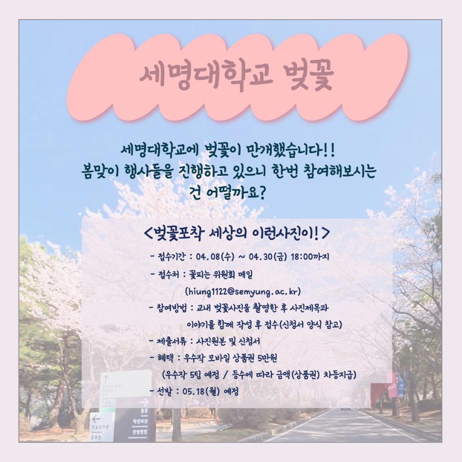 본문 시작 홈으로 SMIT 소식 SMIT 소개 SMIT 교육 SMIT 취업 SMIT 소식 SMIT 입학 홈페이지가이드 갤러리 공지사항 갤러리 경진대회 동아리 갤러리 페이스북 트위터 프린트 세명대알림_4월(2) : 세명대학교 벚꽃 스마트IT학부 11 2026-04-14 세명대알림_4월(2) : 세명대학교 벚꽃 목록 이전세명대알림_4월(1) : 2026학년도 1학기 중간고사 다음 스마트IT알림_4월 : 스마트IT학부 졸업요건 담당부서 : 스마트IT학부 담당자 : - 연락처 : 043-649-1275 최종수정일 : 2024-10-26 만족도조사 만족도 조사 이 페이지에서 제공하는 정보에 대하여 만족하시나요? 매우만족 만족 보통 불만족 매우불만족